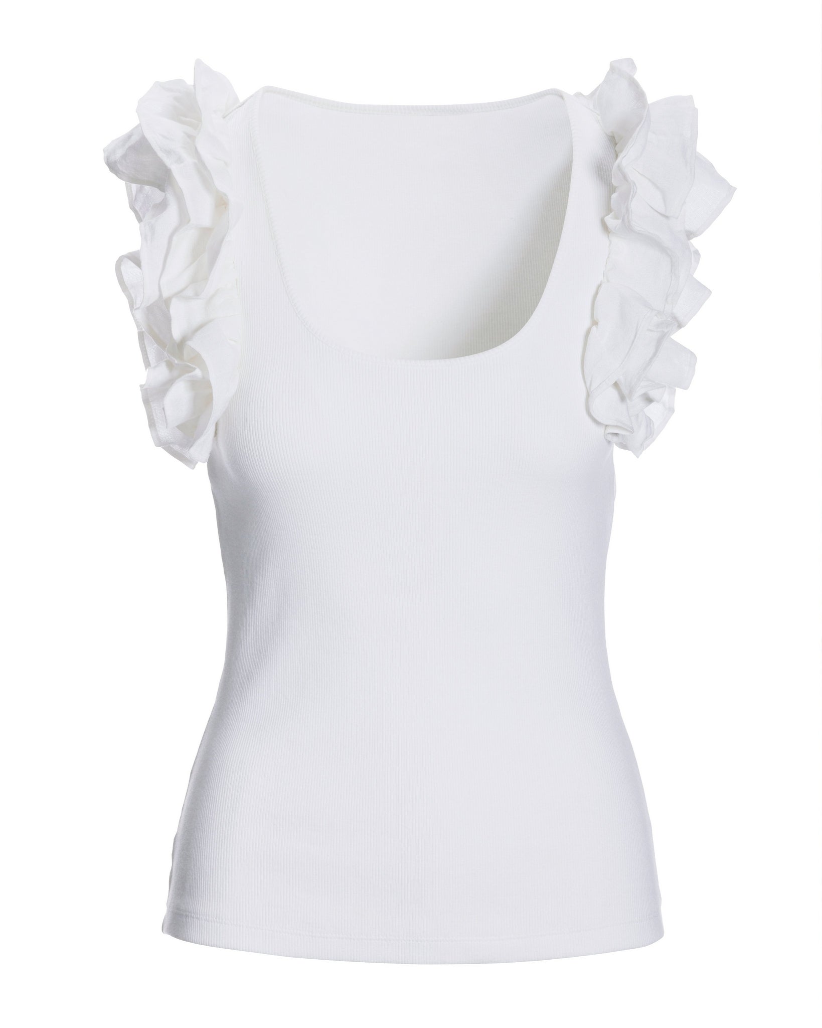 Layered linen ruffles frame the most comfortable ribbed knit scoop-neck top to create effortless feminine looks when paired with flattering bottoms and classic denim jeans.