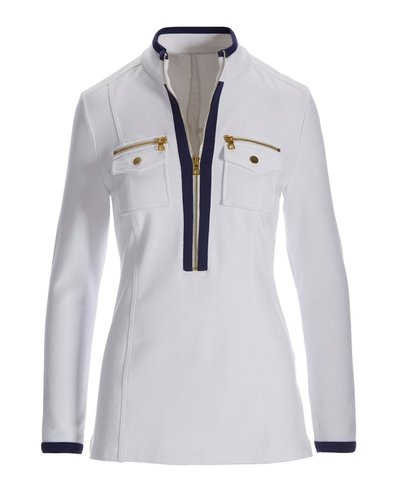 Chic and sporty, this comfortable French terry top checks all the boxes for effortless ease in sophisticated athleisurewear. The sleek look is designed with contrasting trim and gold-tone details, adding distinction to your casual, on-the-go style.