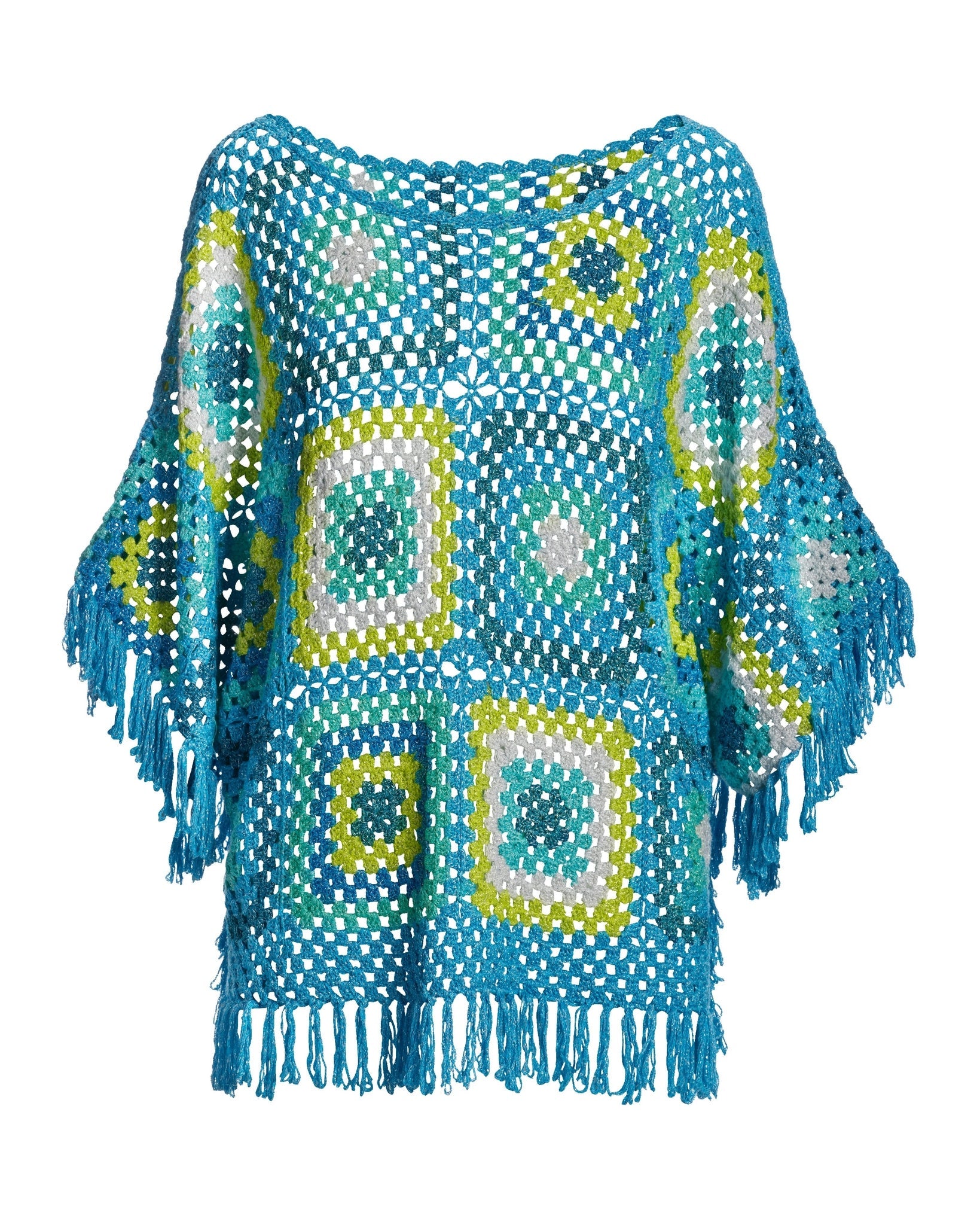 An easy, colorful topper to layer over all of your essential tops and tees, this cool cotton crochet poncho evokes effortless boho vibes...with a touch of Lurex shimmer for glam style.