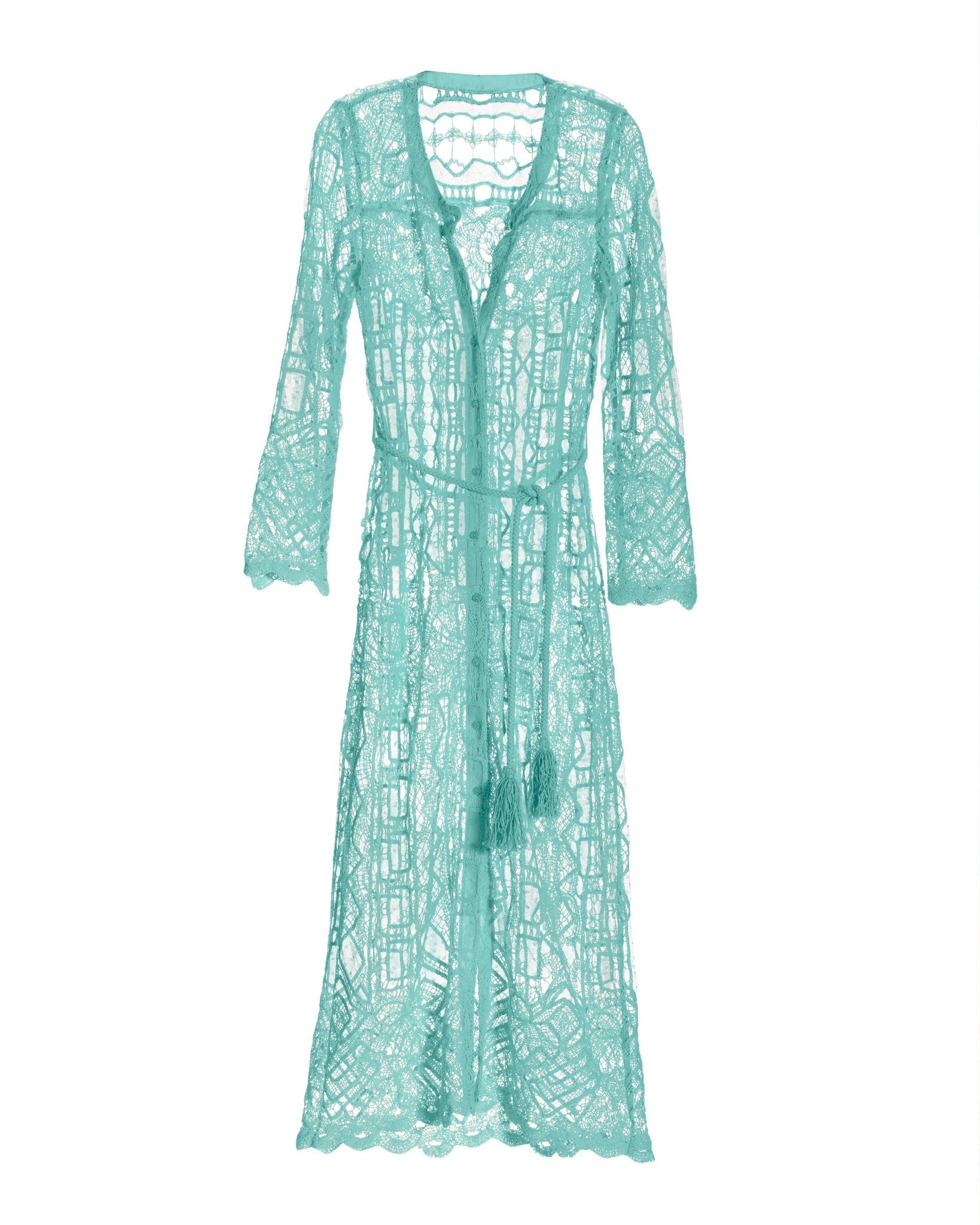 Our crochet duster is a luxe, lightweight layer featuring a stunning open crochet design mixed with swiss dotted mesh fabric. Its scalloped hemline hits at the ankle in the perfect statement length. Wear it buttoned or unbuttoned over the coordinating crochet dress or atop a denim look to add interest.