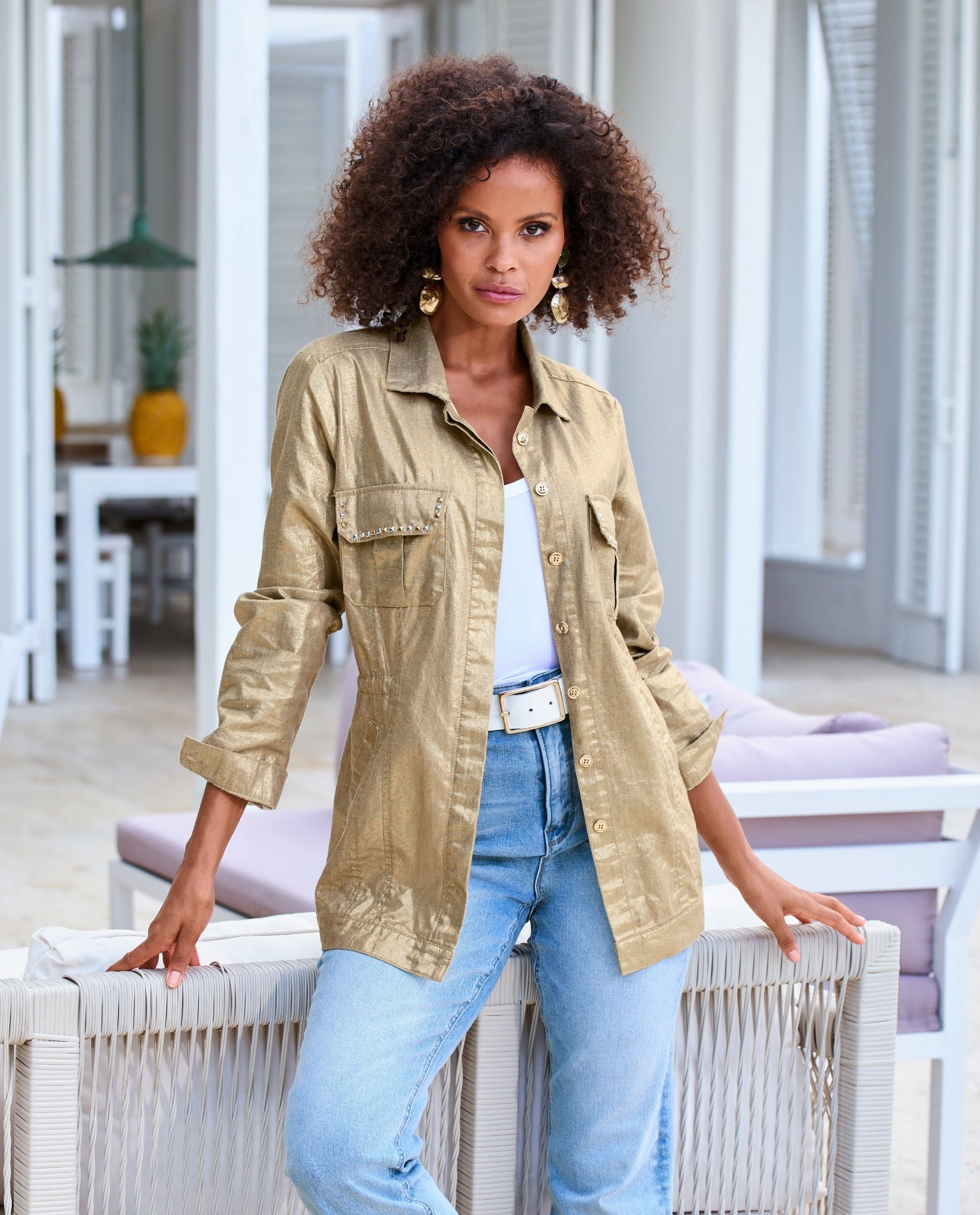 Glam up your sporty cargo look with this metallic brushed linen utility jacket in a lightweight style that gets noticed. Luxe touches elevate this layer-over-everything fashion piece.