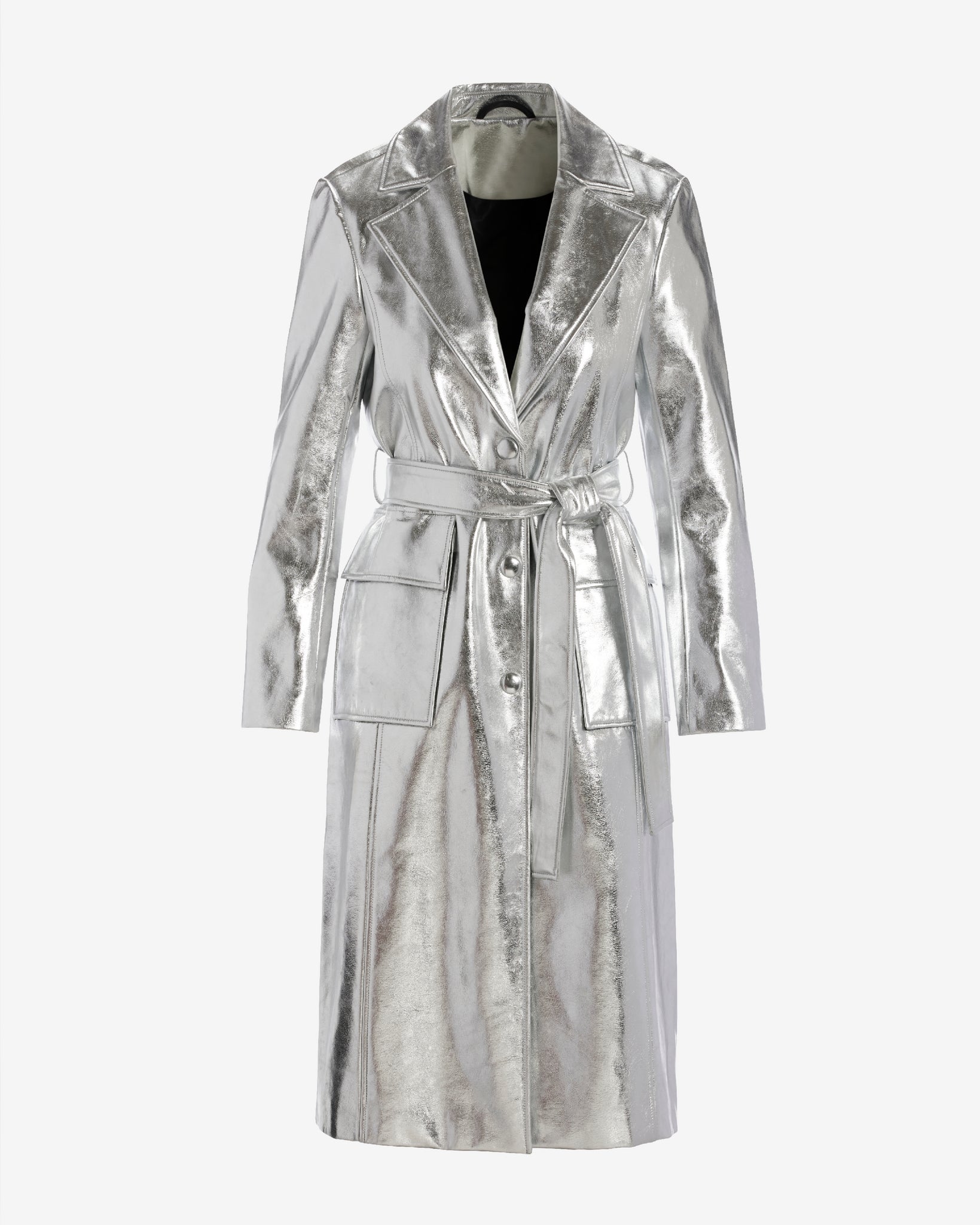 A high-shine metallic finish brings bold, modern appeal to the classic trench coat. Our Metallic Faux Leather Blazer-Style Trench is designed with a waist-cinching belt to create a flattering silhouette plus large patch-flap pockets for functional style.