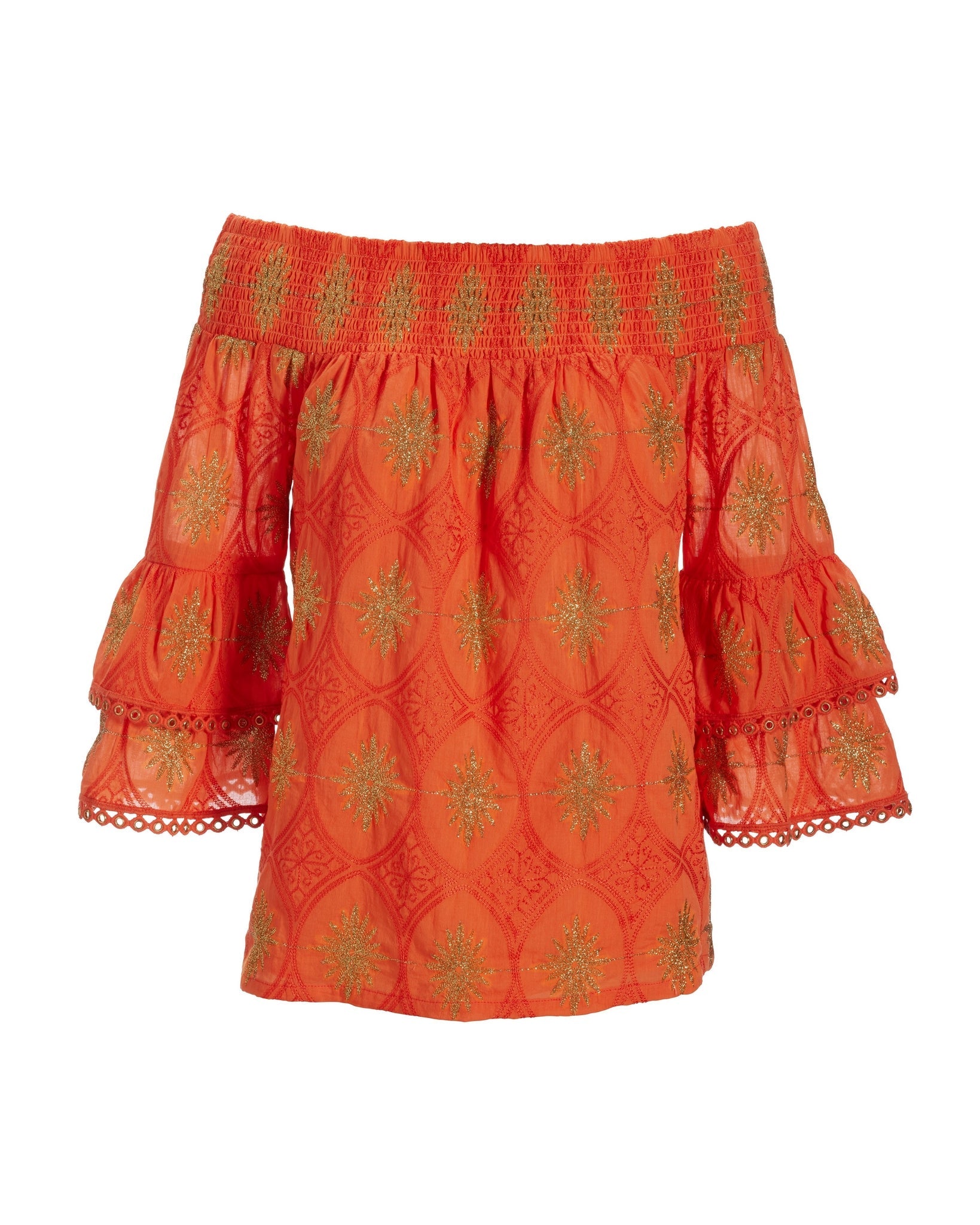 This gold embroidered top is fashioned from our best-selling dress design for comfortable, sophisticated, and easy style. Effortless silhouette combined with smocked off-the-shoulder neckline and flattering statement sleeve with gold grommet detail finish the look.