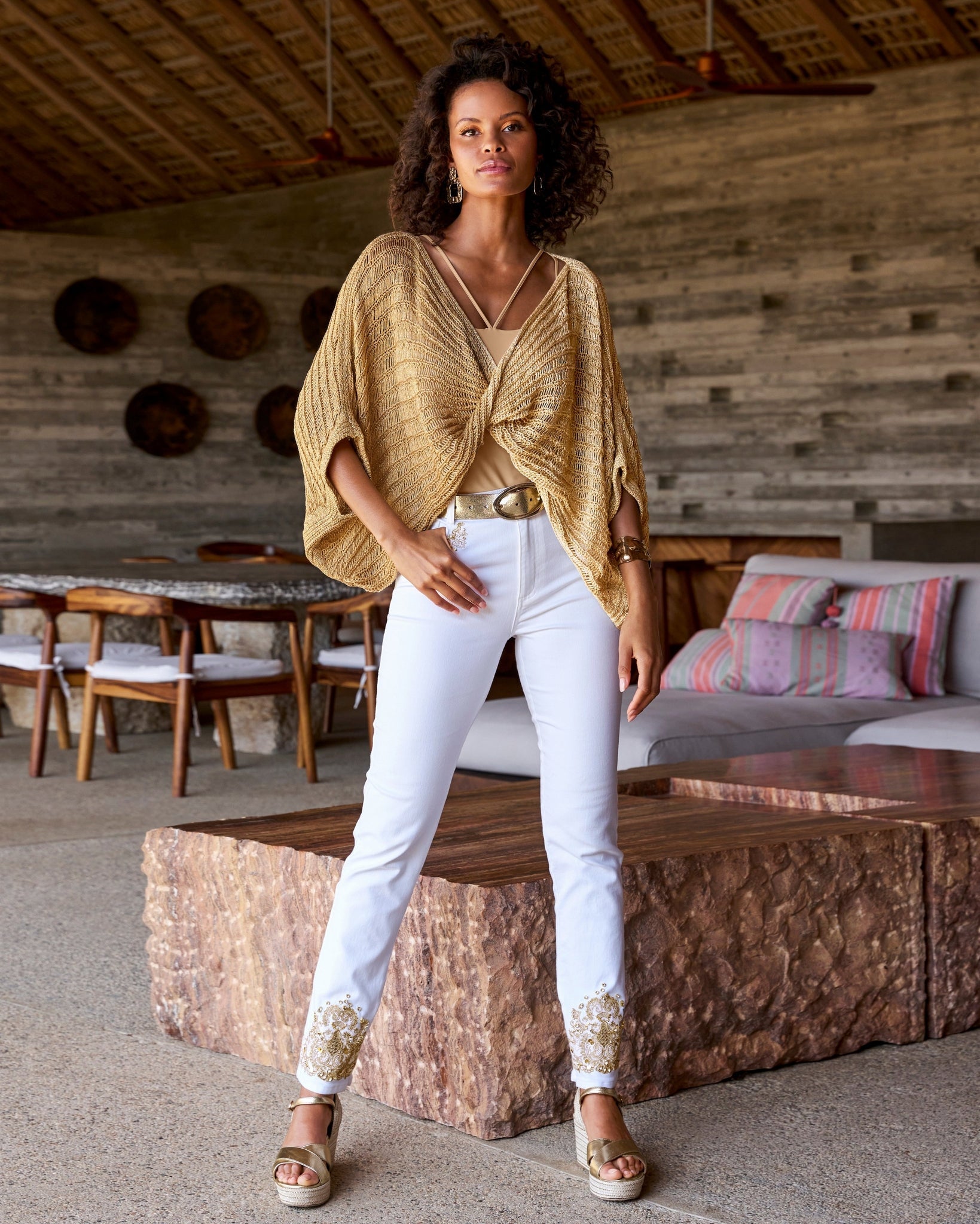 Add a hint of sparkle to your layers with the Metallic Twist Sweater Poncho. Woven with soft, metallic-flecked yarns, this wrap-style piece features a relaxed fit and ribbed trim. Effortlessly elegant, it’s the perfect finishing layer for everyday ease or evening polish.