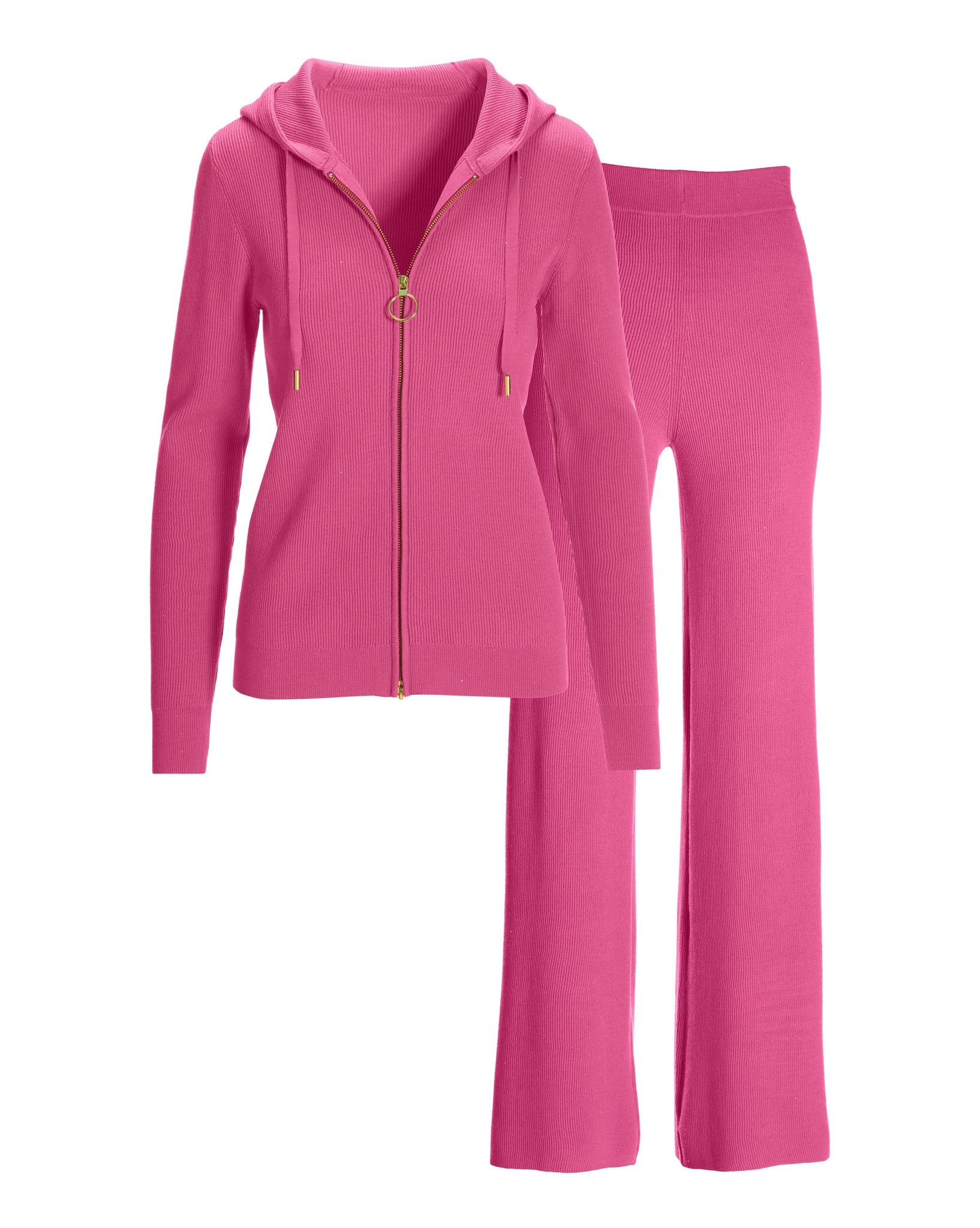 A comfy ribbed texture lends comfort to our cozy- glam two-piece hoodie lounge set. Allover mini sequins create touches of shimmer on an easy zip-up top and matching wide-leg pants.