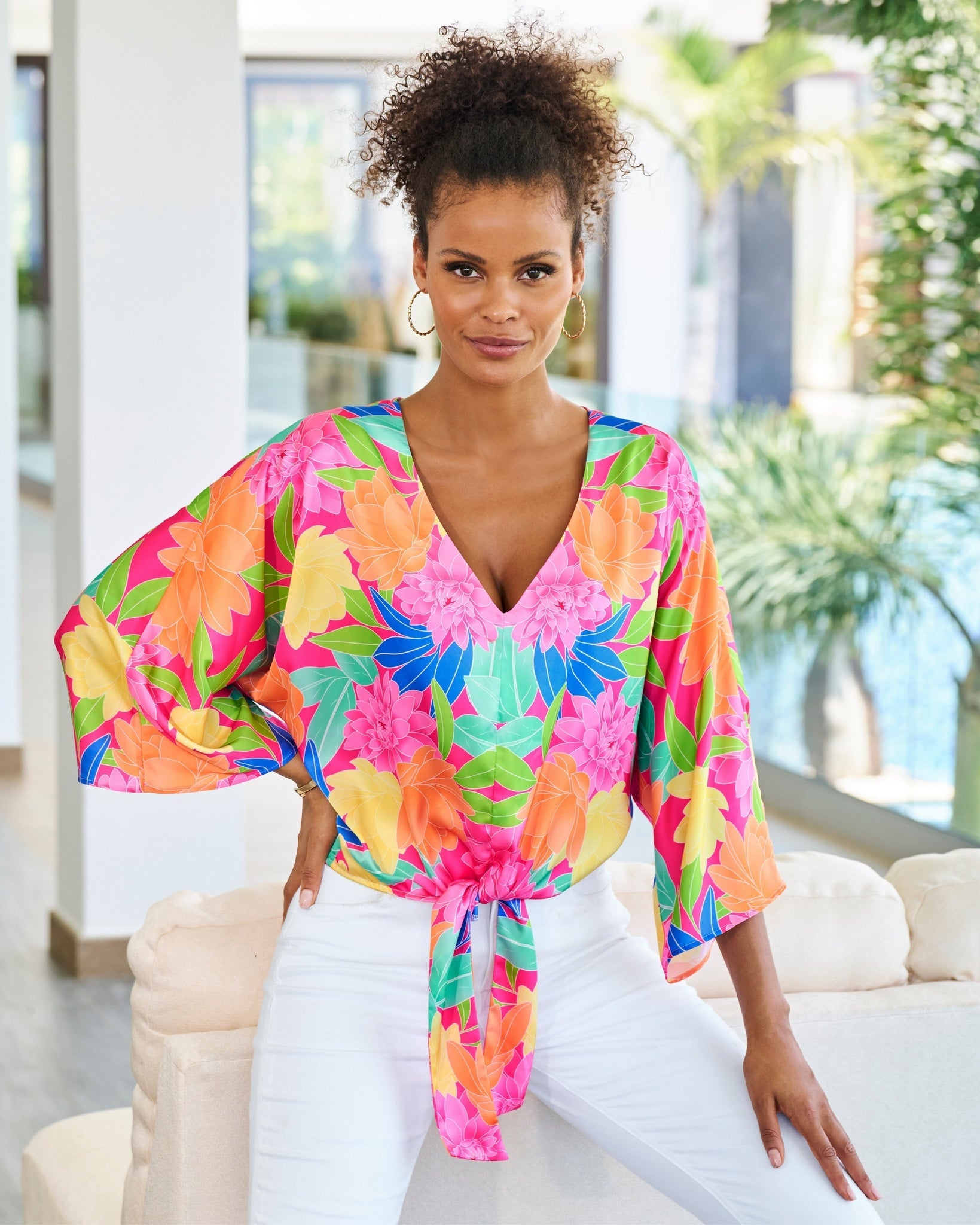 Mirrored Blooms Print Kate Tie Front Charmeuse Blouse Pink Multi