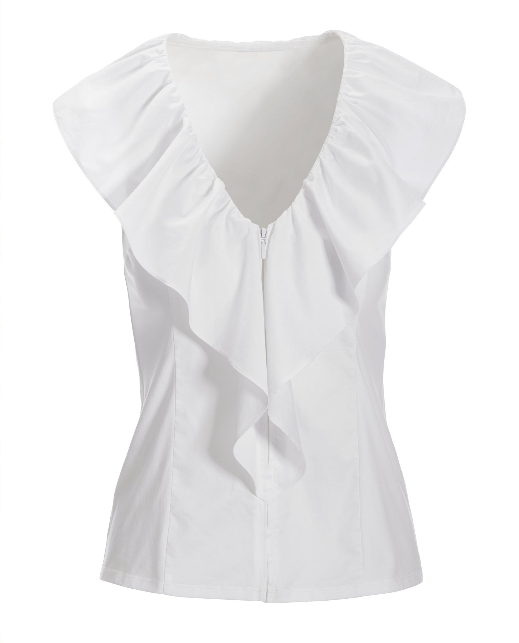Crafted to capture attention in a harmonious blend of poplin and knit textures, our Mixed Media Poplin Ruffle Front-Zip Knit Top ensures comfort with a touch of femininity.
