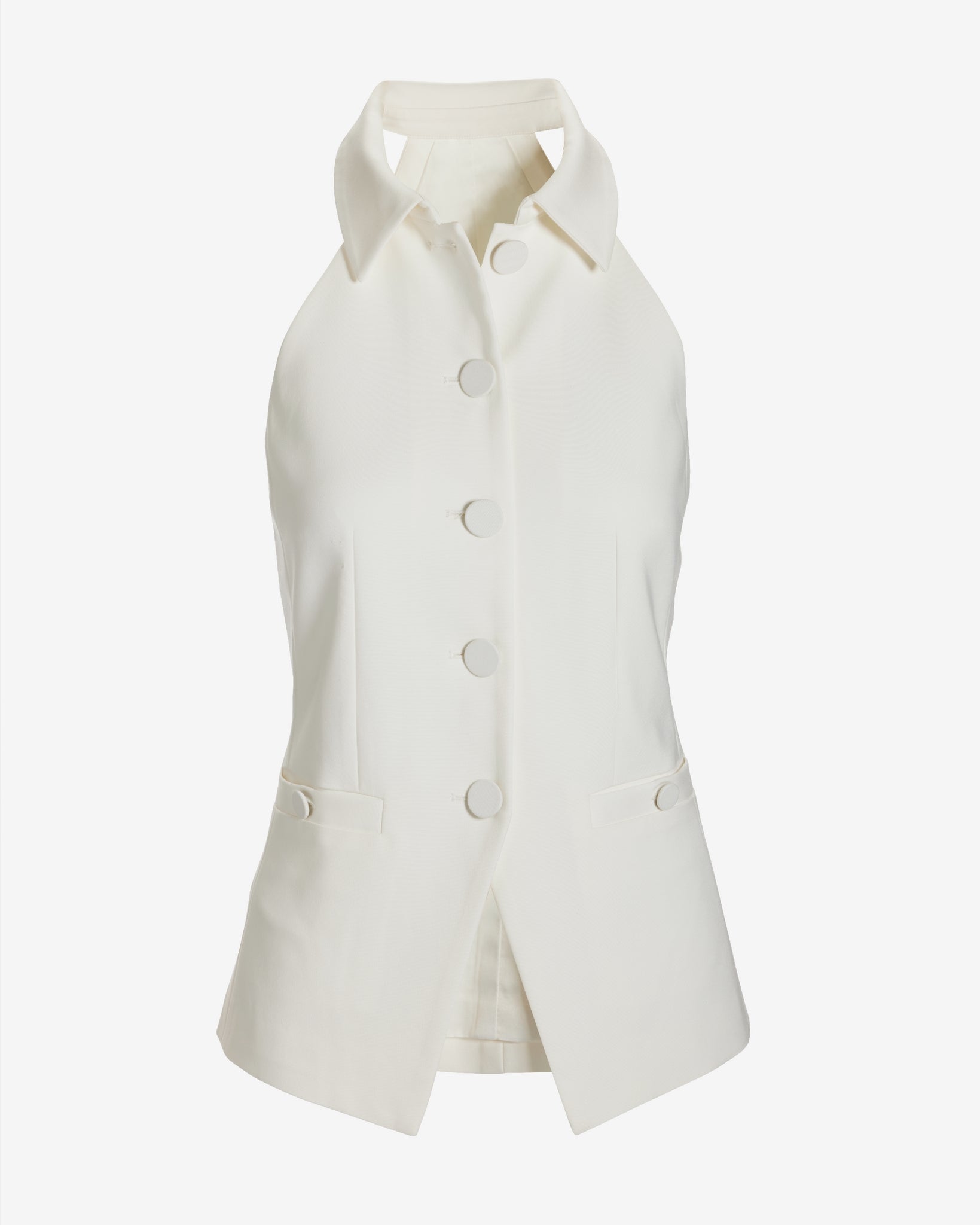 The Modern Halter Cut Away Vest takes suiting in a bold new direction. With a sleek halter neckline, structured tailoring, and button-front closure, this piece balances sharp lines with unexpected edge. A collar and faux front pockets give it polish, while the sleeveless silhouette keeps it confidently cool. Pair it with wide-leg pants or shorts for a standout look that’s all yours.