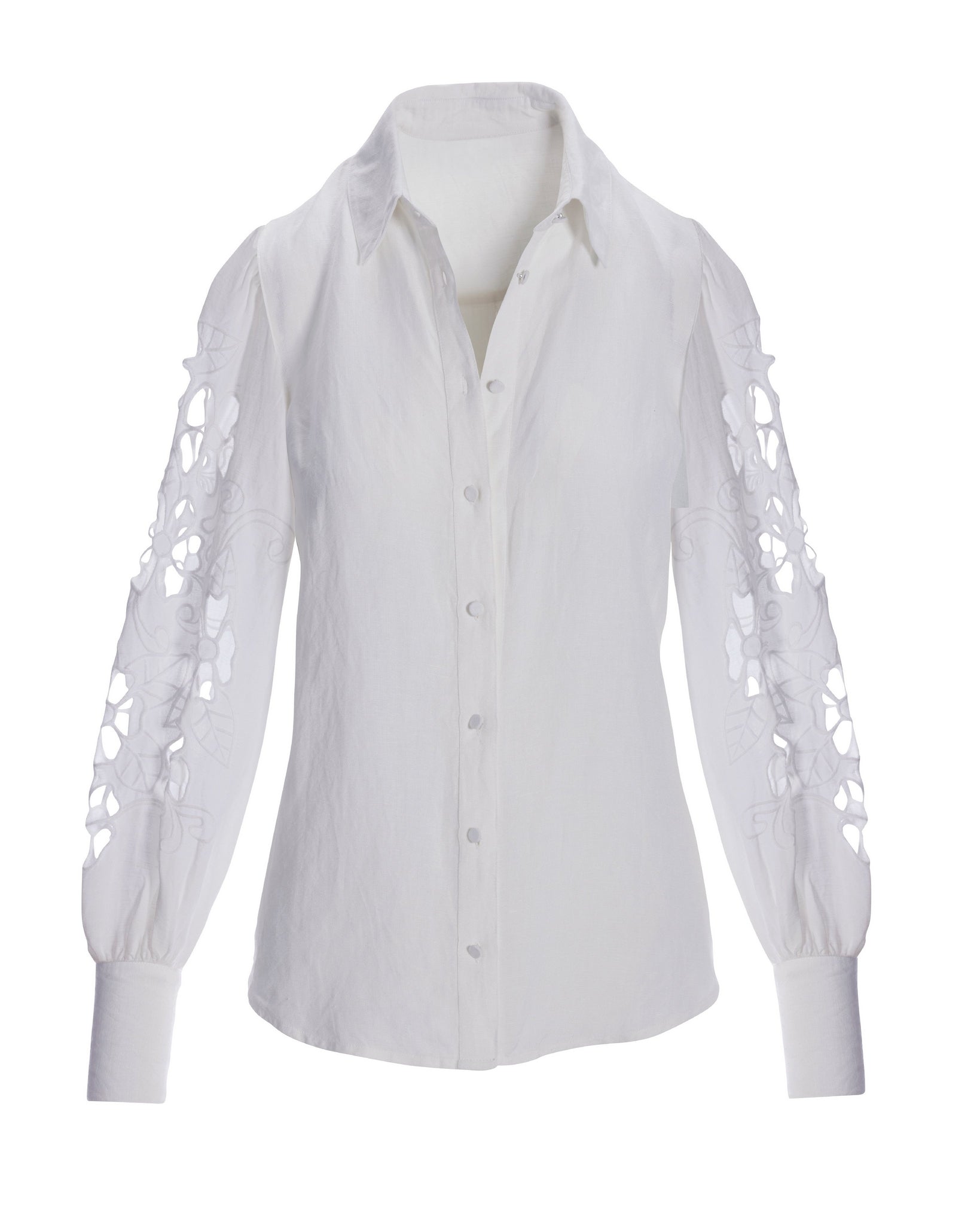 Long sleeves with covered-button cuffs and openwork embroidery. Pointed collar. Covered button front closure. Yoke pleat. Shirttail hem. 55% linen/45% viscose. Machine wash. Imported.