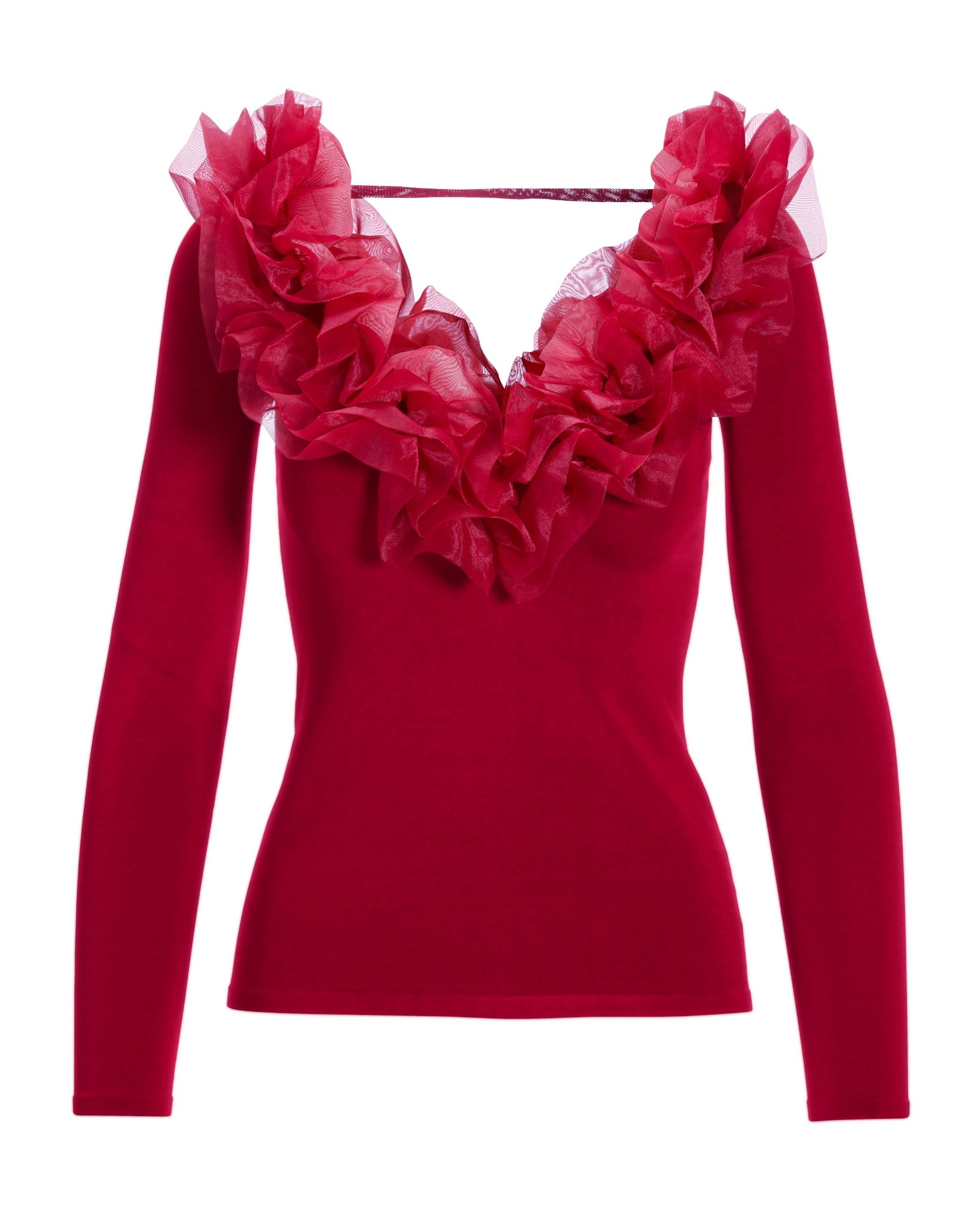 Dramatic ruffle detail creates a glamorous look for making an unforgettable impression whenever you step out in this long-sleeve V-neck sweater. The luxurious viscose blend has slight stretch with a sleek, smooth feel against the skin and offers a shapely fit.