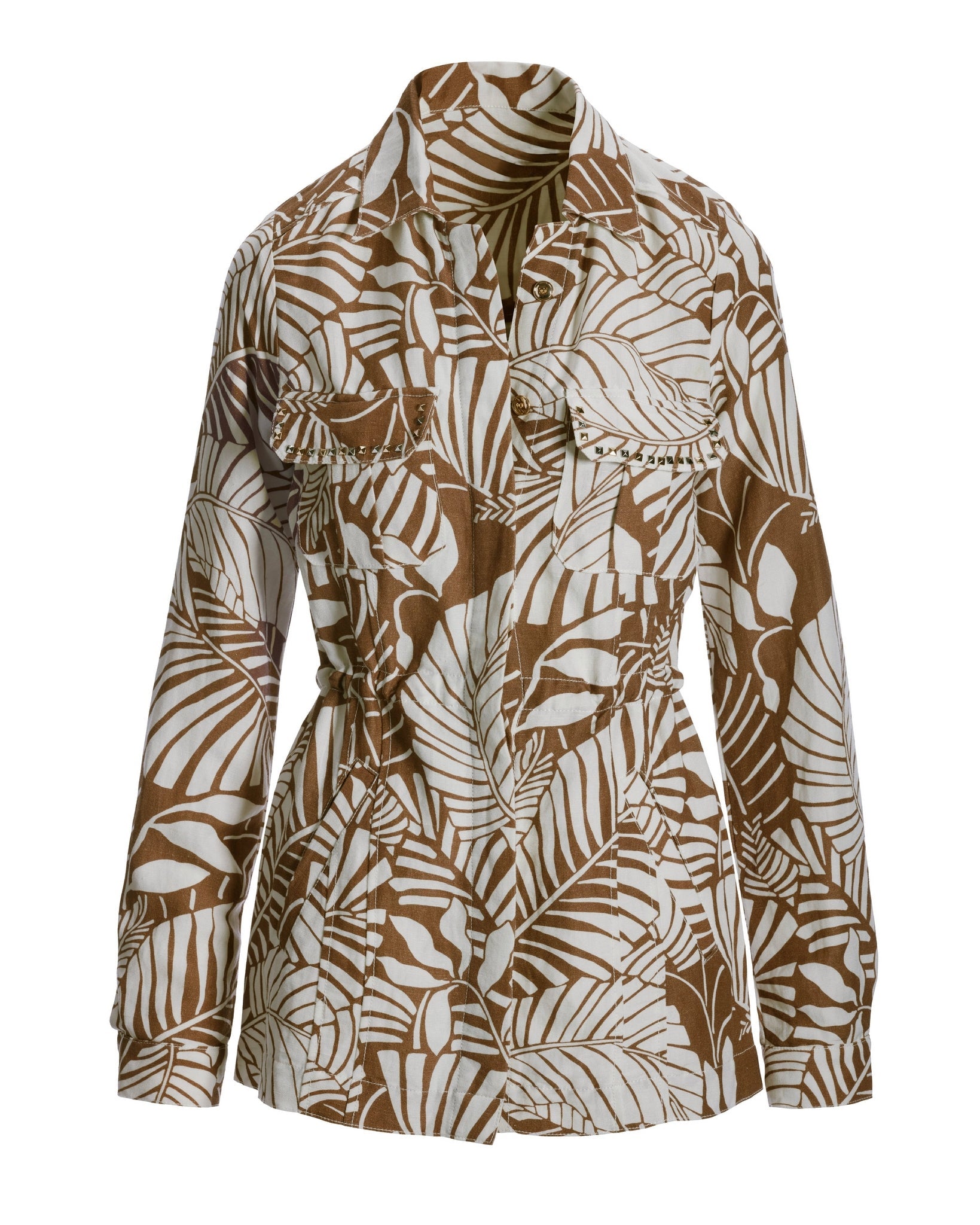 Outlined Florals Print Embellished Linen Utility Jacket Brown/White
