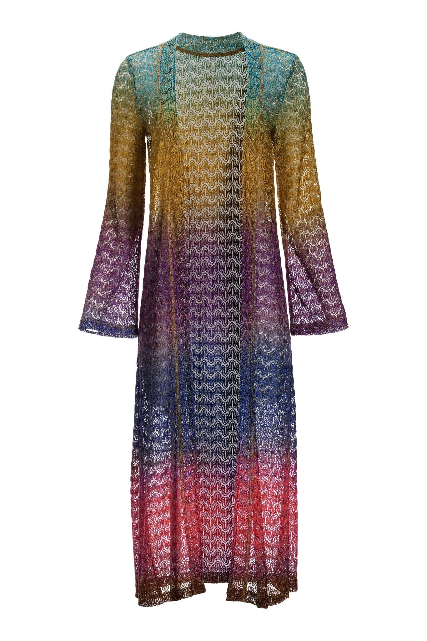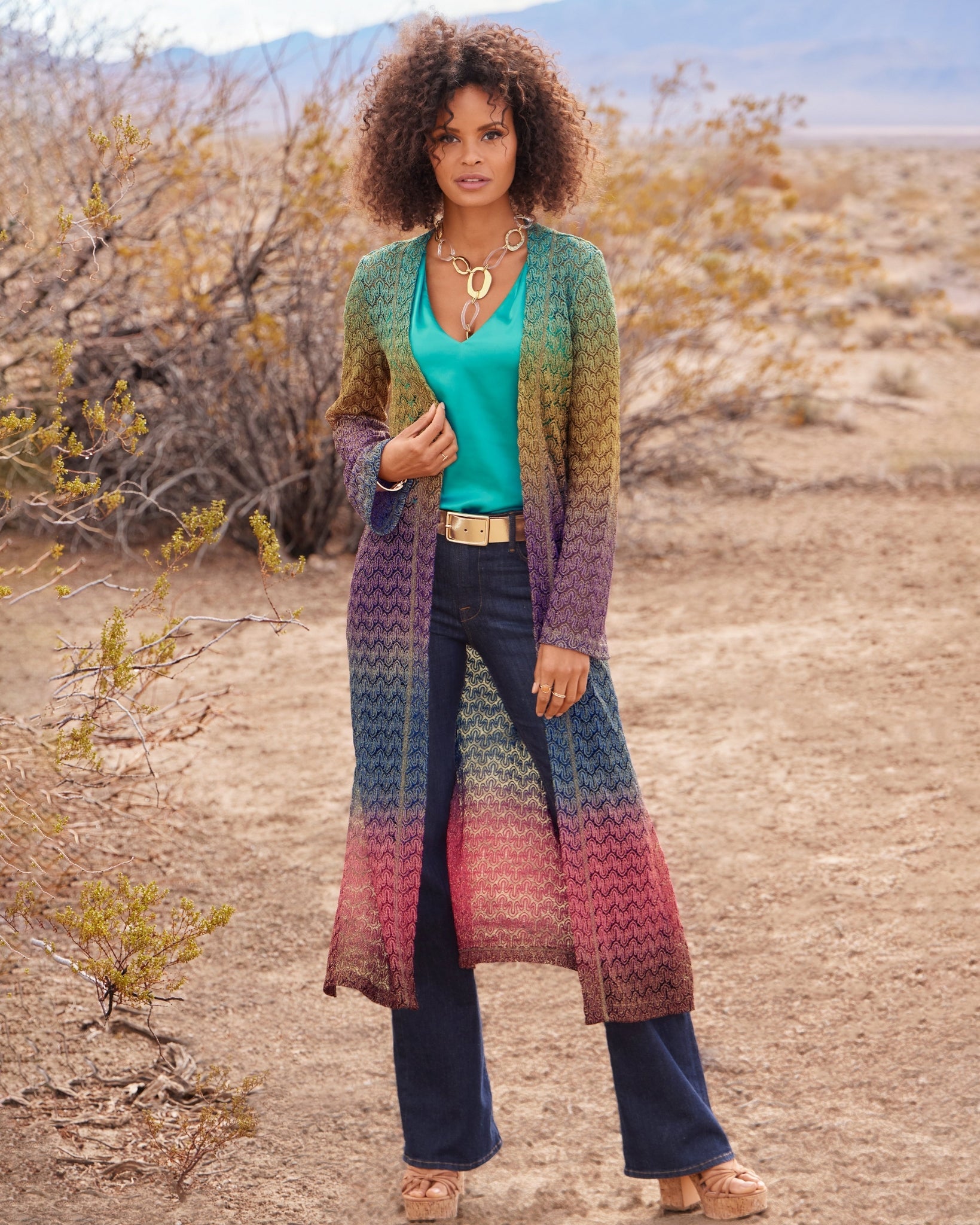 Colorful ombré allure imbued with shimmering style make this lightweight and effortless sweater duster the one to layer over tops and tees.