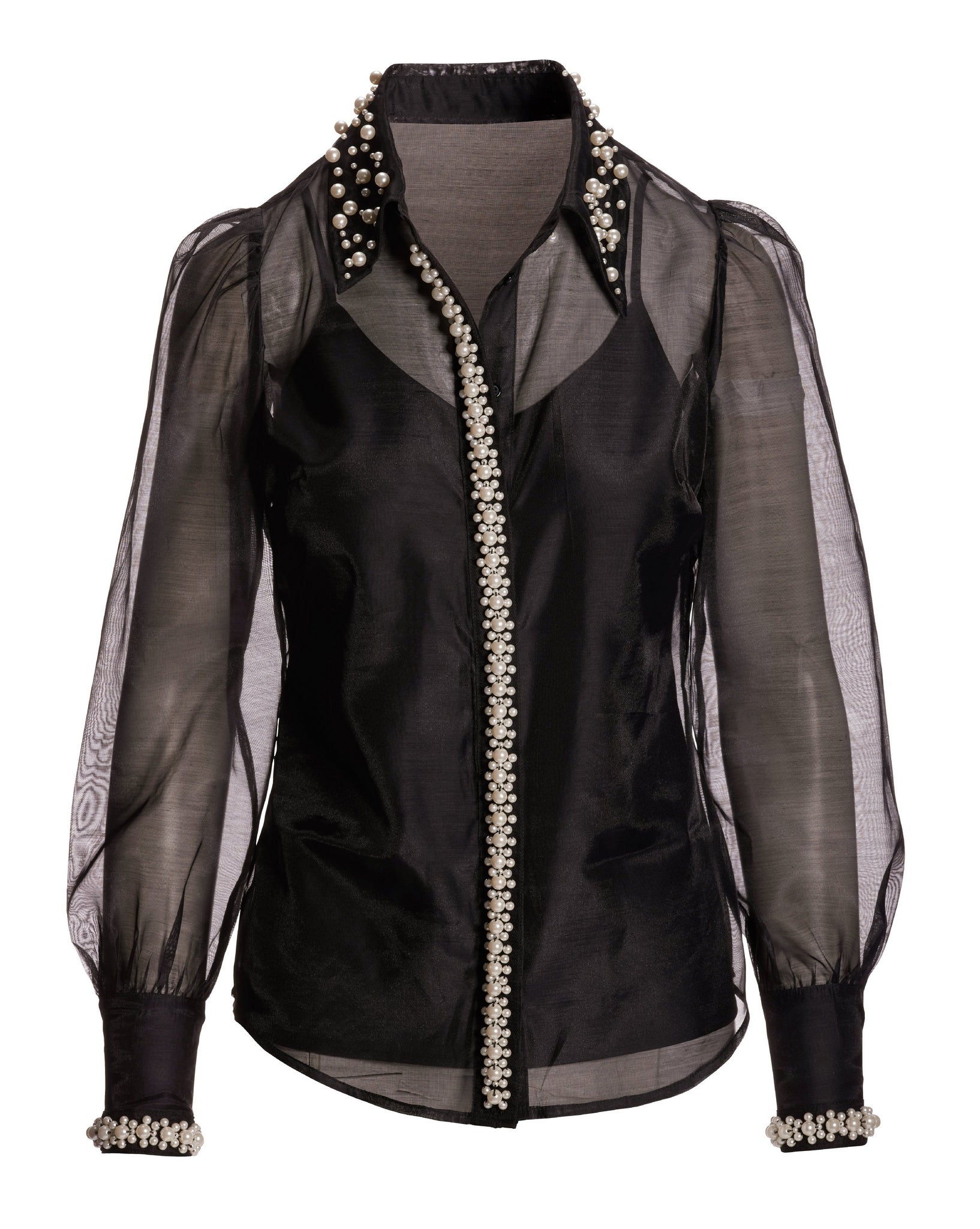 Pearl Embellished Organza Victoria Drama Sleeve Shirt Black