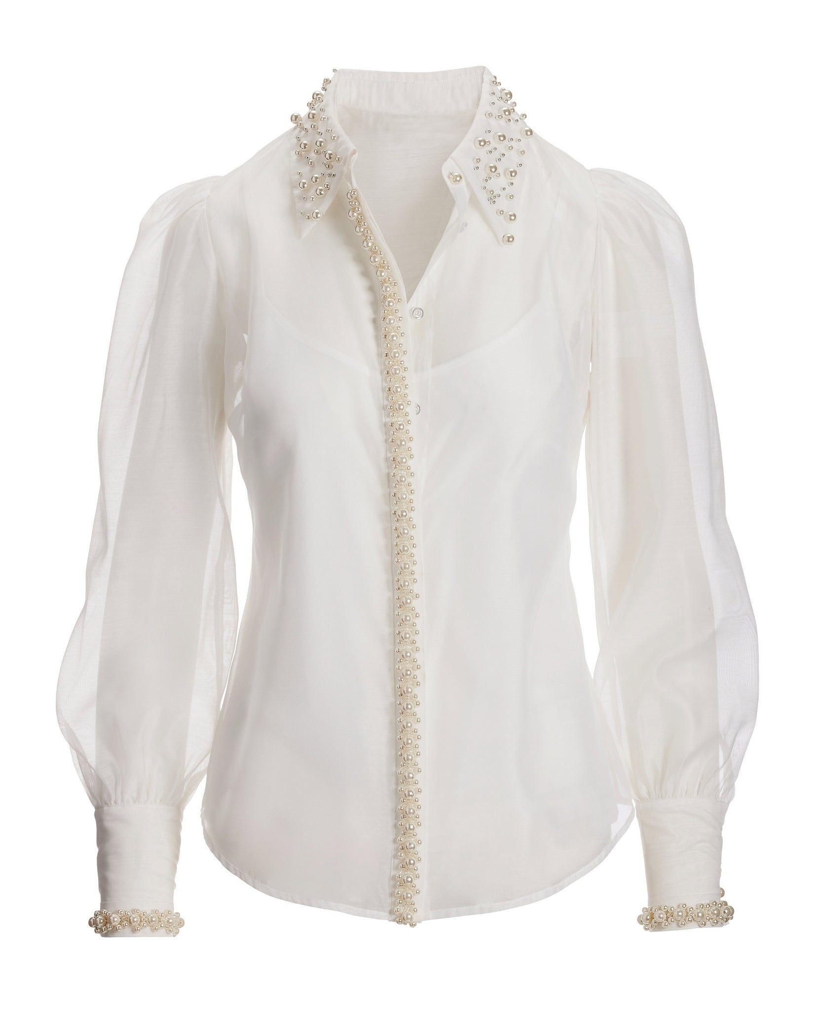Luxe pearls meet elegant organza in this unique, drama-sleeve shirt. This versatile occasion blouse offers tuck-in or wear-out styling options to add feminine style to any look.