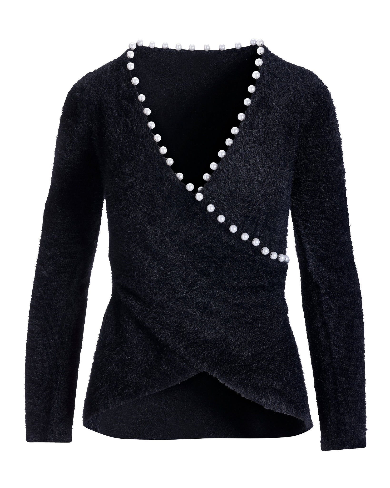 Our Pearl Trim Plush Surplice Sweater elevates your winter wardrobe with a touch of timeless elegance and unmatched coziness with its iridescent pearl-trim neckline and effortless style. It's the perfect companion for casual denim or dressy pants.