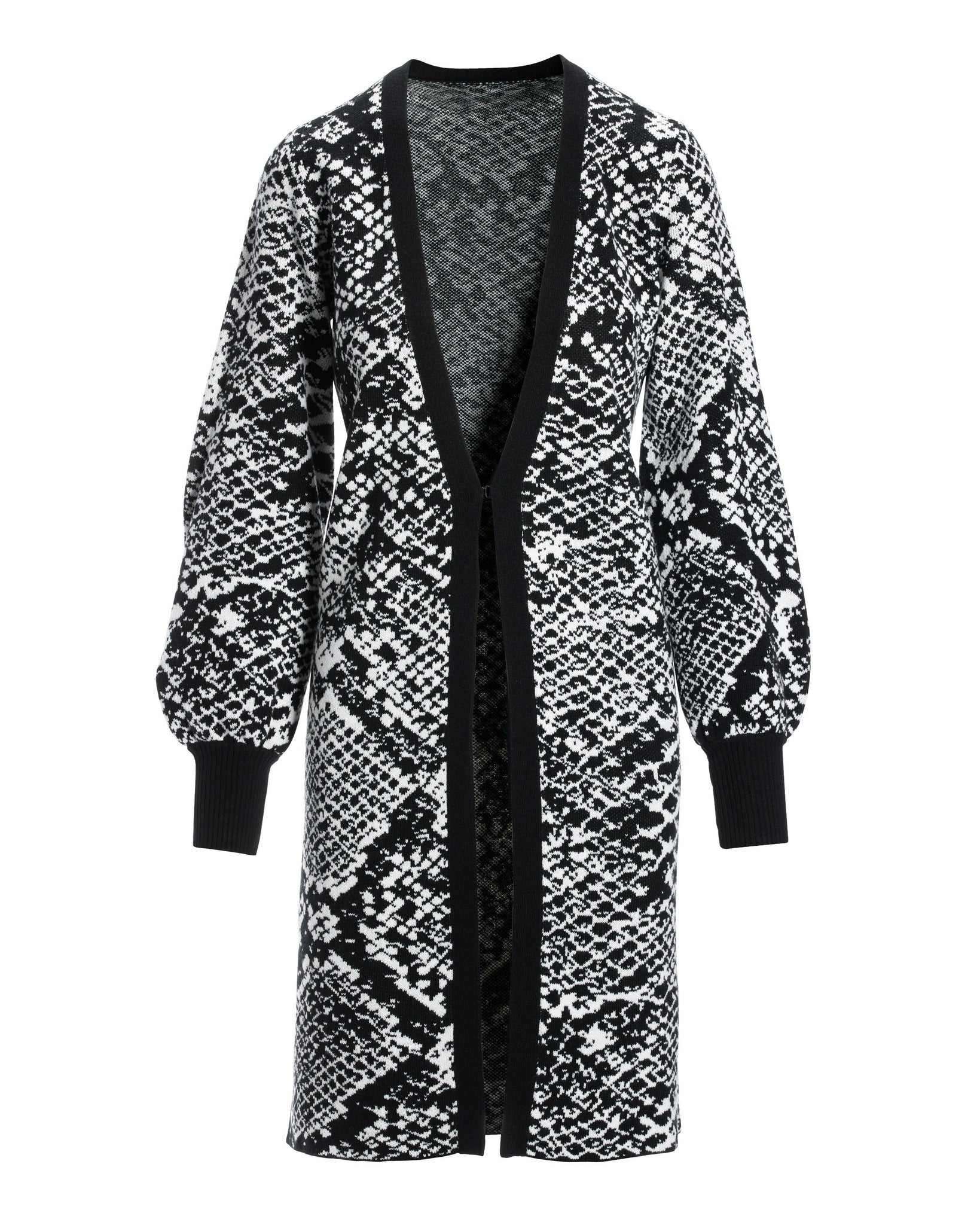 Wrap yourself in warmth with this on-trend sweater duster featuring a captivating python pattern. Perfect for layering, its lightweight knit and effortless fit will keep you comfortable all day long. Whether you're strolling through the city or curling up by the fire, our layering piece adds a touch of exotic sophistication to any outfit.