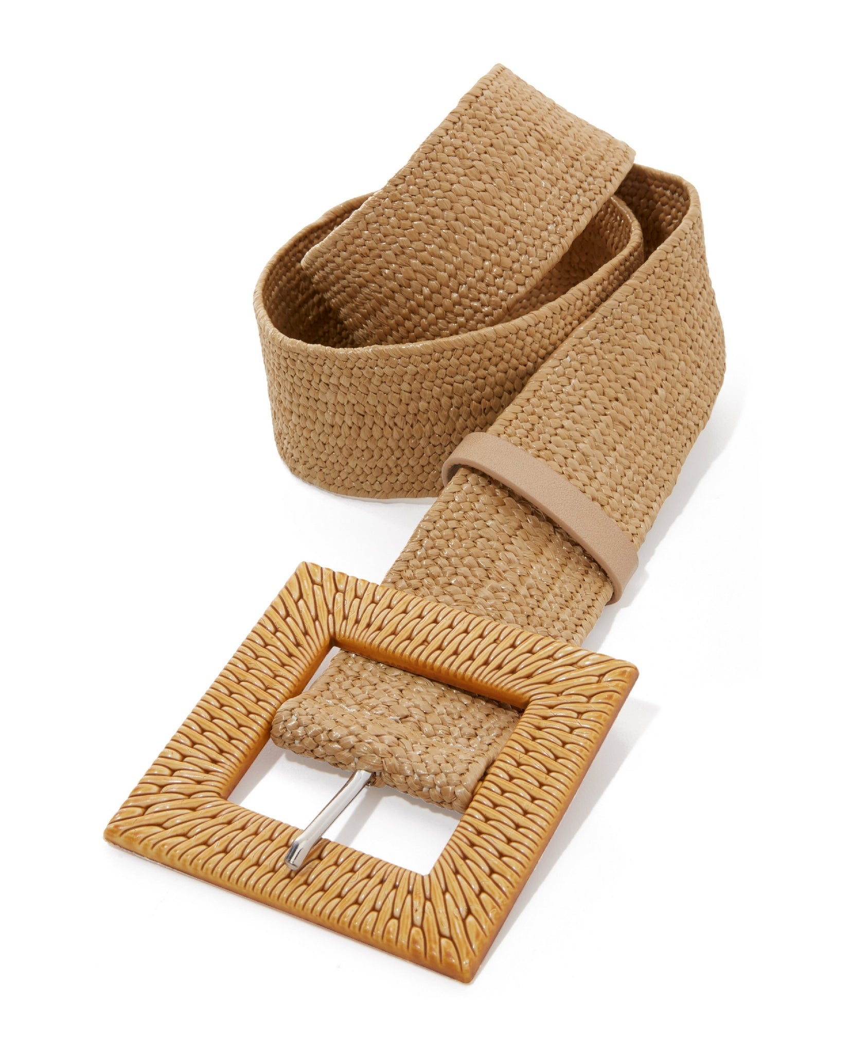 Boasting an effortless stretch design and a bold square buckle, this raffia woven belt is a versatile accessory to layer over button-down shirts, dresses, tops, sweaters and jackets to create stylish and comfortable looks.