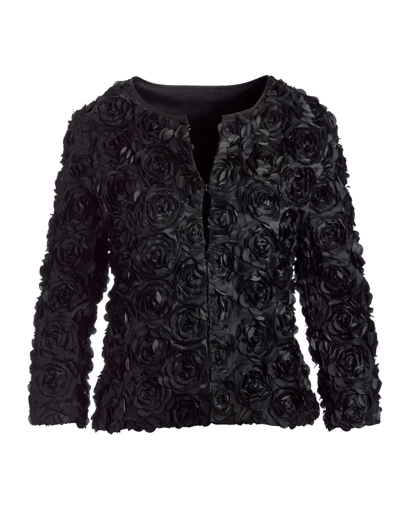 Our new spring statement layer mixes unexpected details and endless versatility. This three-quarter sleeve jacket features blooming rosettes to add dimension and uniqueness for one-of-a-kind style. Dress it down with jeans for work, or layer it over an occasion dress for celebrations and events.