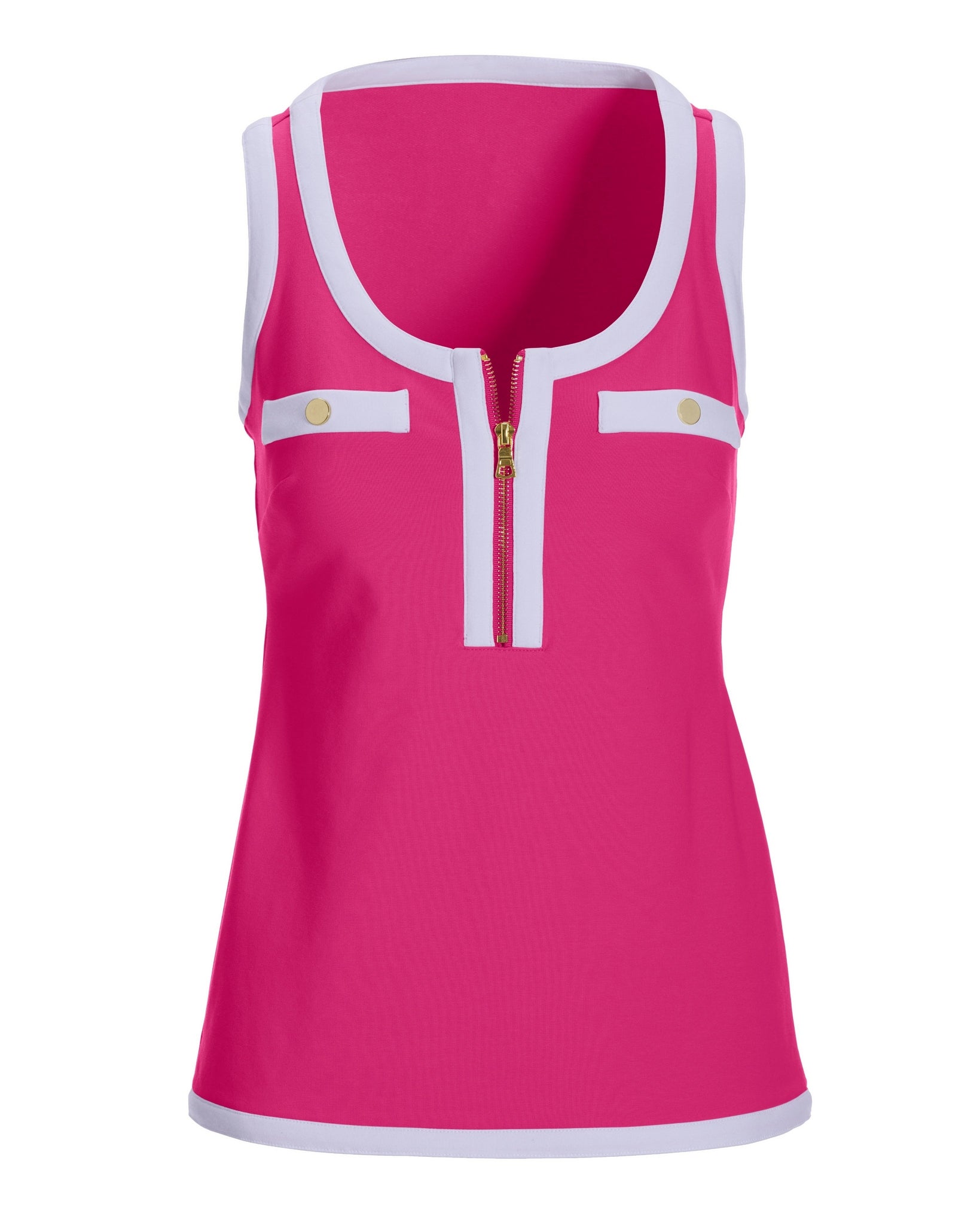 An effortless everyday sleeveless top with sporty chic color block details, your zip knit top boasts a comfortable scoop-neck silhouette and French terry fabrication. Detailed with distinctive hardware, complete this wear-everywhere style with denim, shorts and skorts.
