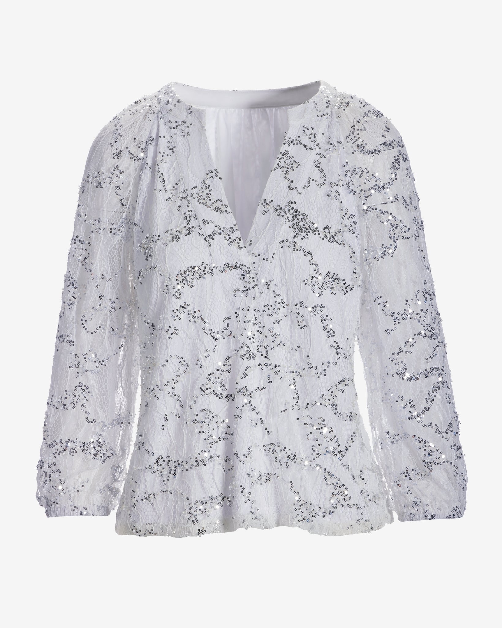 Our Sequin Lace Three-Quarter Sleeve Top sparkles with an allover sequin lace overlay, bringing effortless glamour to any look. A banded collar and V-neckline enhance its flattering fit, while sheer lace sleeves add a touch of romance. Wear it solo or layered for a statement finish.