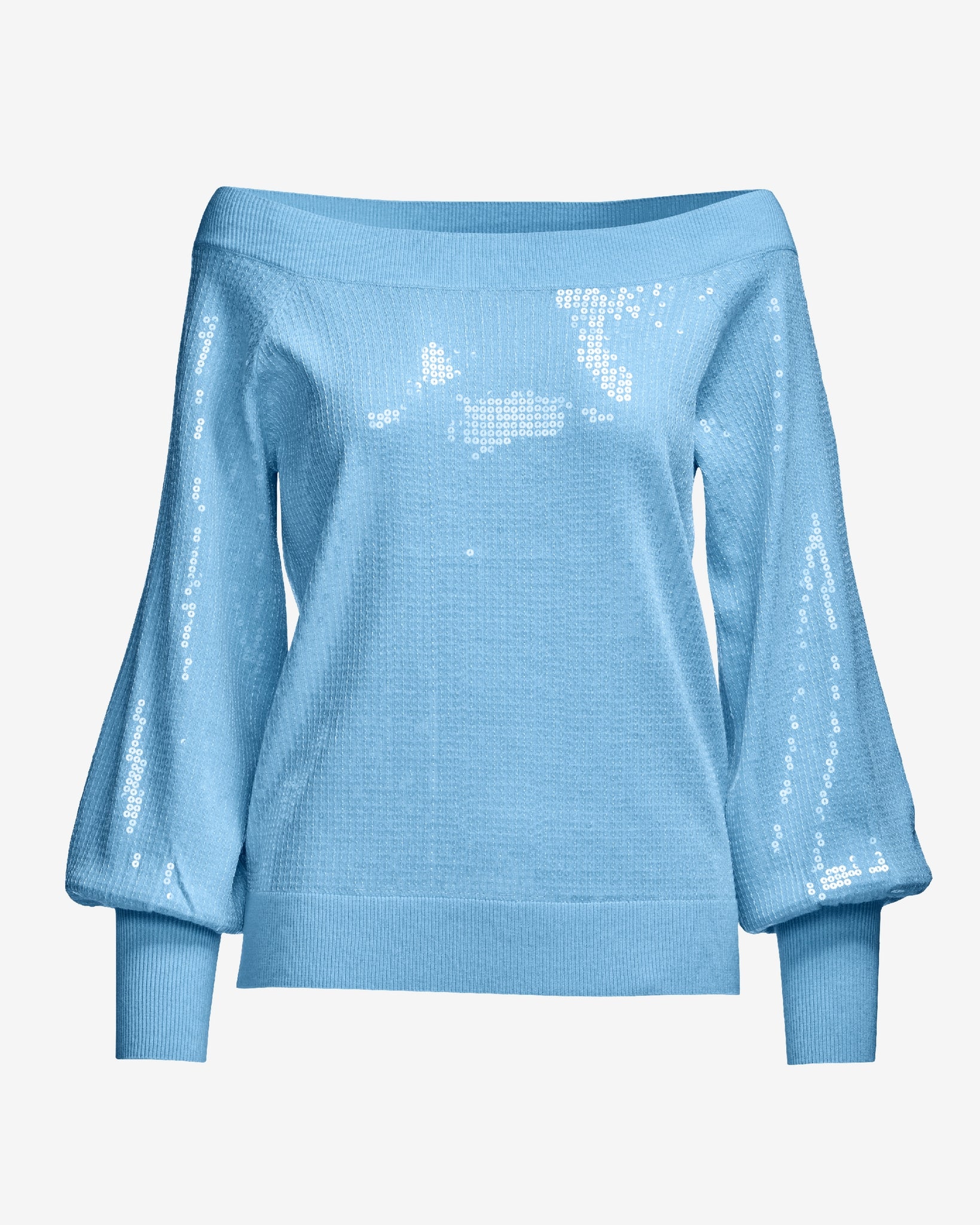 Add a touch of sparkle to your wardrobe with our sequin slouchy sweater. Featuring a relaxed neckline, balloon sleeves with ribbed cuffs, and a shimmering design, it’s a stylish choice for cozy evenings or casual get-togethers.