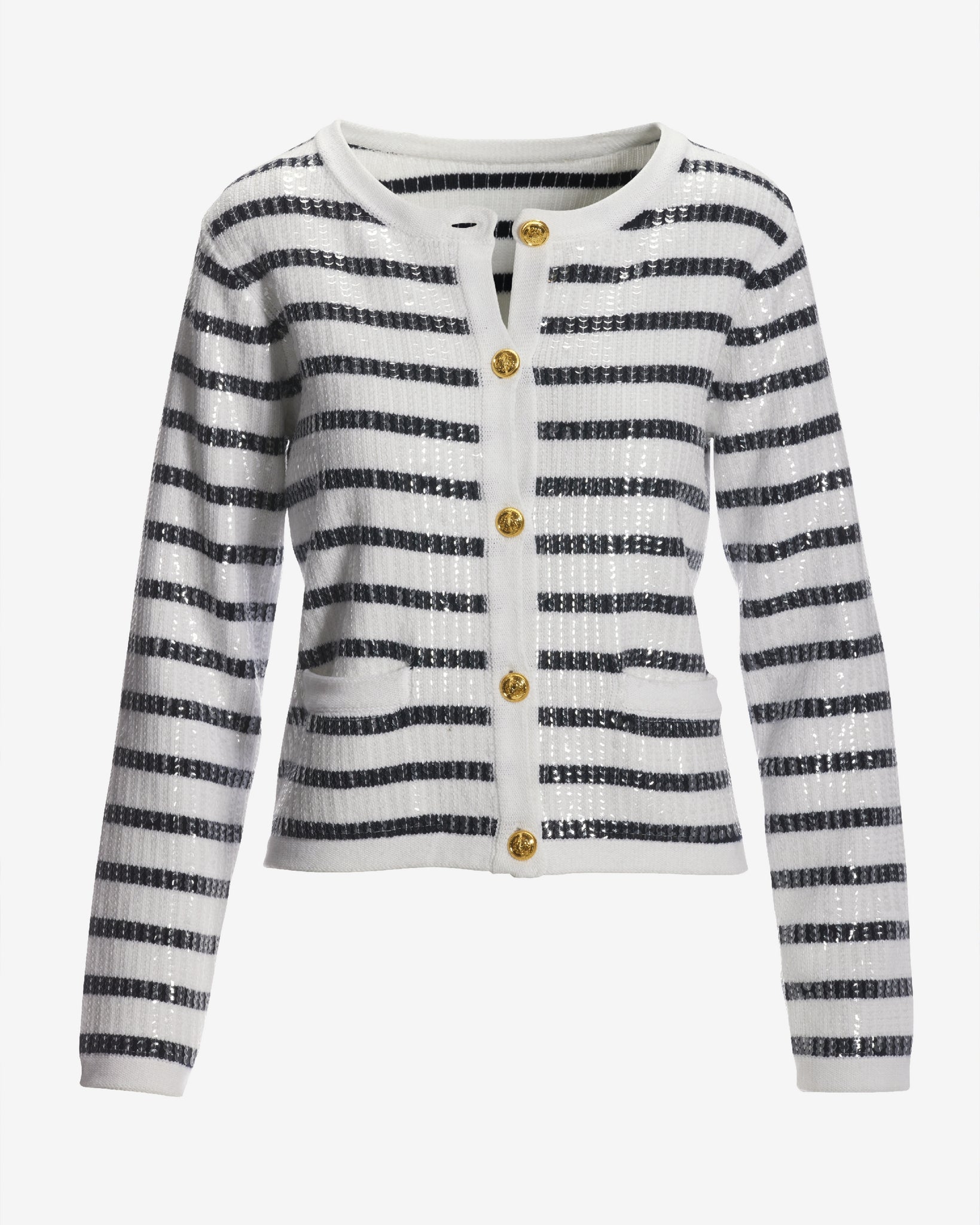 Our Sequin Stripe Cardigan is a must-have layer for your seasonal edit, featuring nautical-inspired stripes elevated by shimmering sequins. Effortlessly stylish, it adds a coastal vibe to any ensemble–ideal for those breezy evenings by the water.
