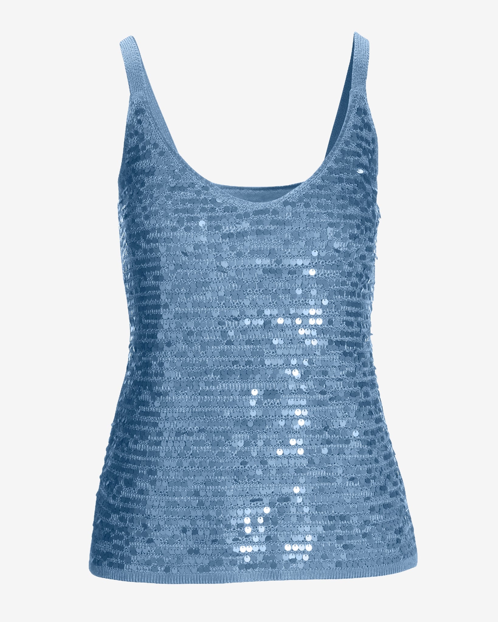 Lending glam style to denim, slacks, shorts and skirts, this exceptionally versatile sequin V-neck sweater tank will be a wardrobe go-to from season to season.