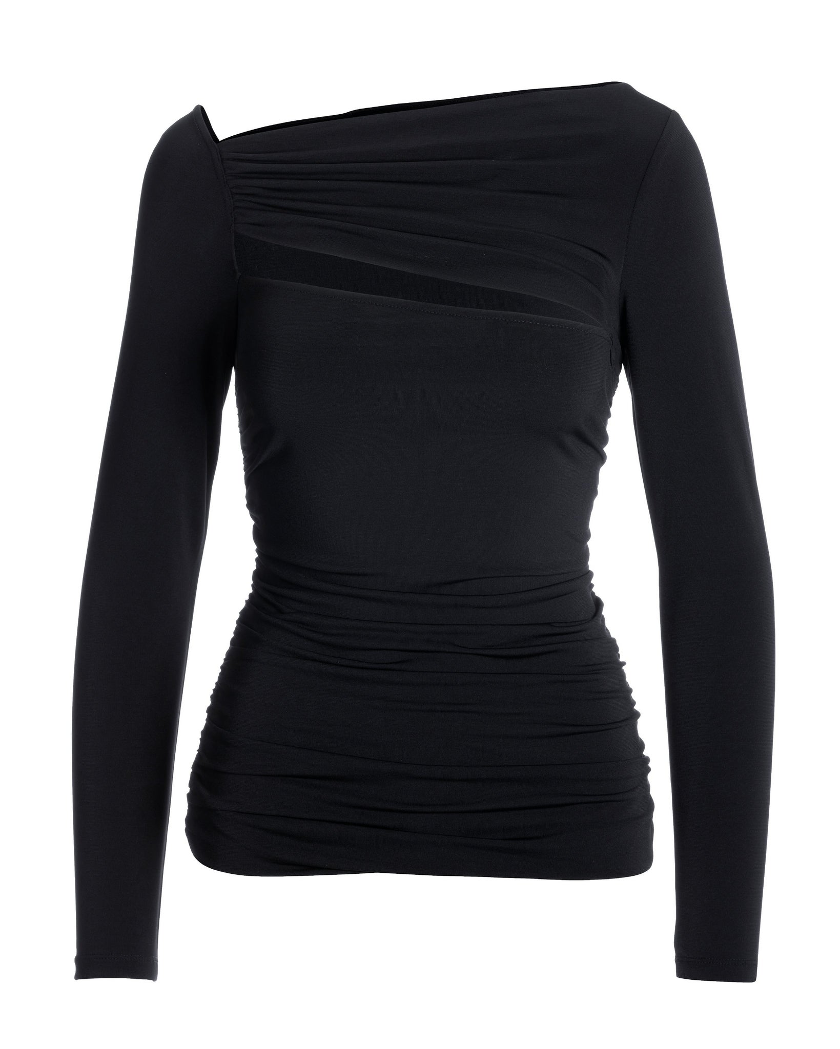 An asymmetric neckline cutout adds sexy appeal to this comfortable knit top for a night out or weekend outfit. With slimming ruched sides, this long-sleeve pullover is both flattering and sophisticated.