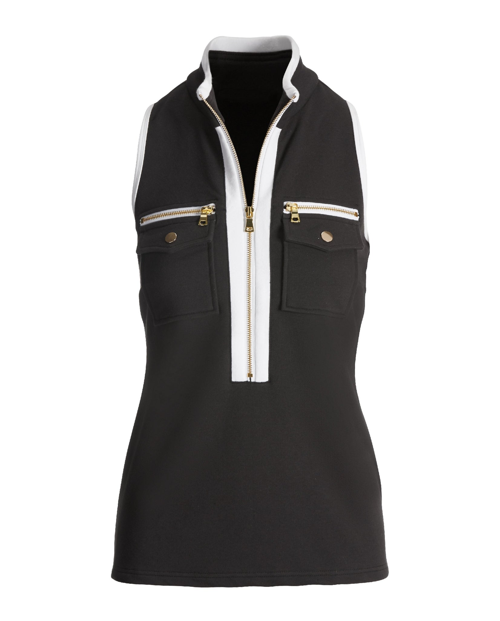 Effortlessly comfortable with sporty-chic details, your favorite French terry chic-zip look gets an update in a new sleeveless silhouette. Detailed with exposed gold-tone zippers, snap utility-style pockets, and color block trim, complete this wear-every-day style with denim, shorts, and skorts.