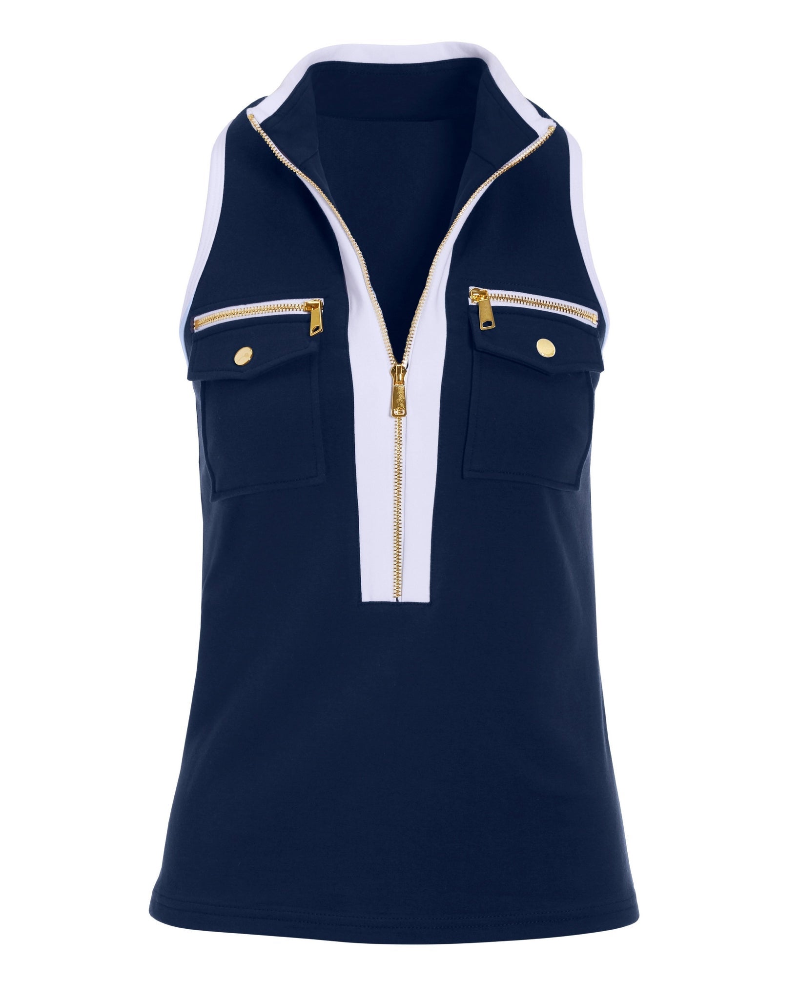 Effortlessly comfortable with sporty-chic details, your favorite French terry chic-zip look gets an update in a new sleeveless silhouette. Detailed with exposed gold-tone zippers, snap utility-style pockets, and color block trim, complete this wear-every-day style with denim, shorts, and skorts.