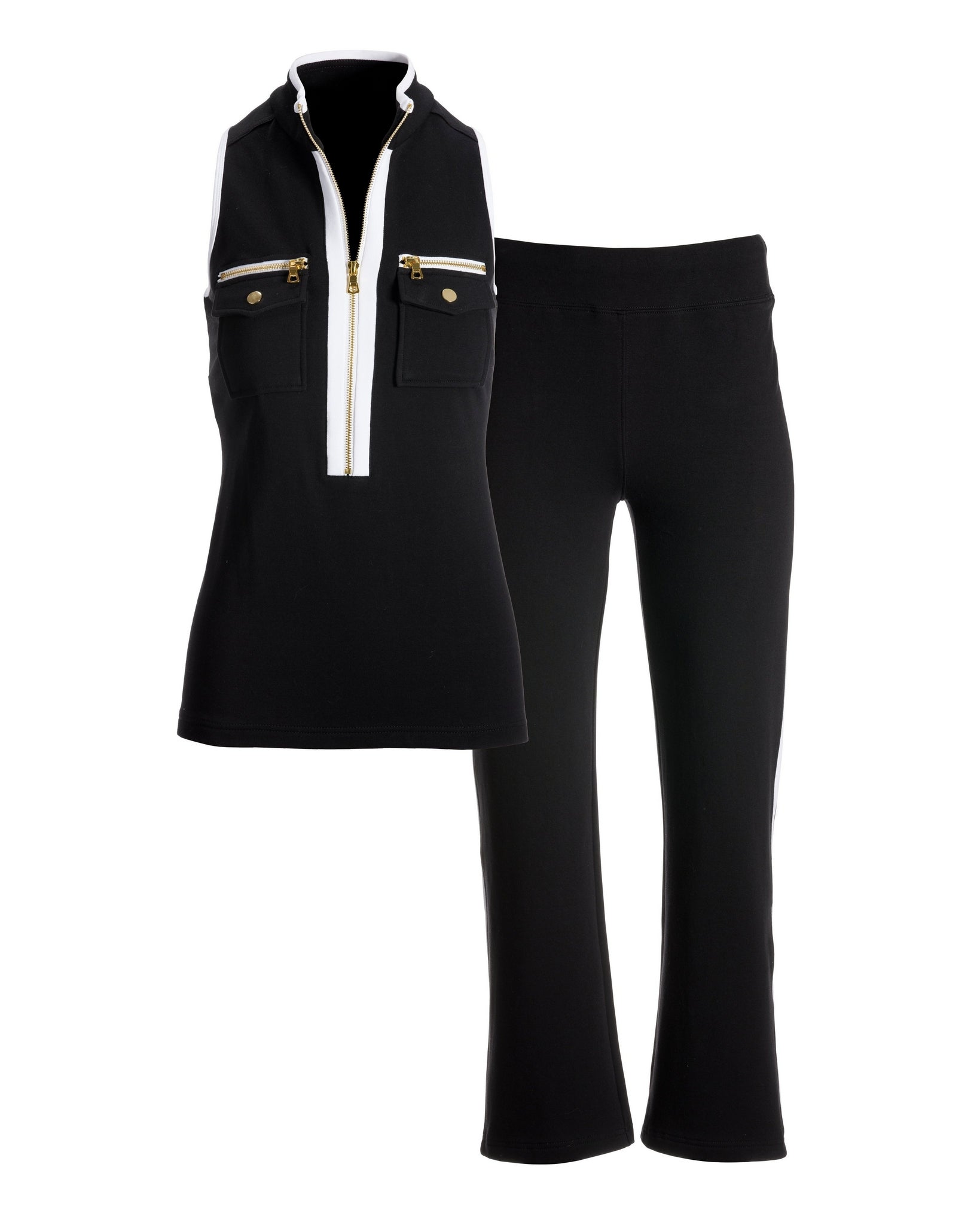 Sophisticated and chic, this sporty French terry warm-up checks all the athleisure boxes for effortless style. The two-piece set includes a comfortable sleeveless zip-front top with zip/snap flap pockets and an easy pull-on elastic-waist cropped pant for on-the-go and off-duty days.