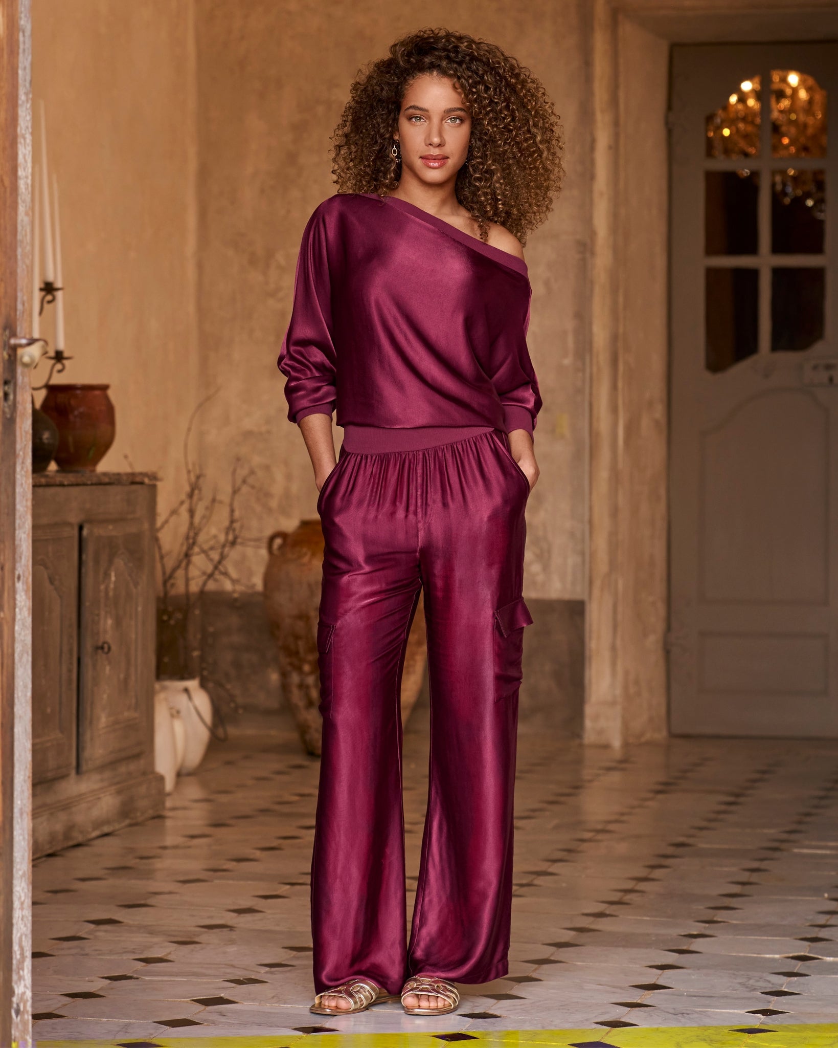 Slouchy Charmeuse Cargo Lounge Set Maroon