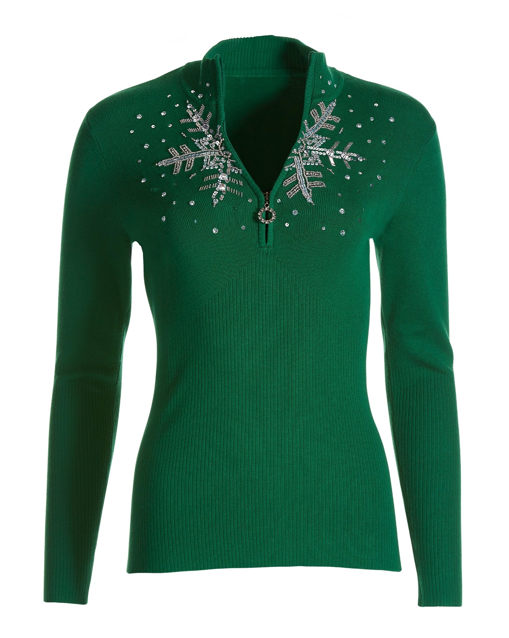 With exquisite detailing, this best-selling snowflake-embellished sweater sparkles brilliantly in style. Zipper adjusts to the neckline you want - from snug and cozy to more open and laid-back.