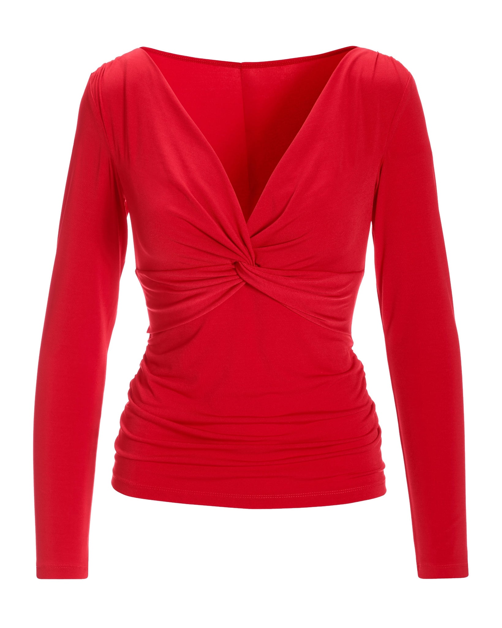Designed to take your everyday looks to next level style, this comfortable long-sleeve knit top features a flattering knot-front neckline detail and side ruching, adding instant so-chic sophistication to any outfit.
