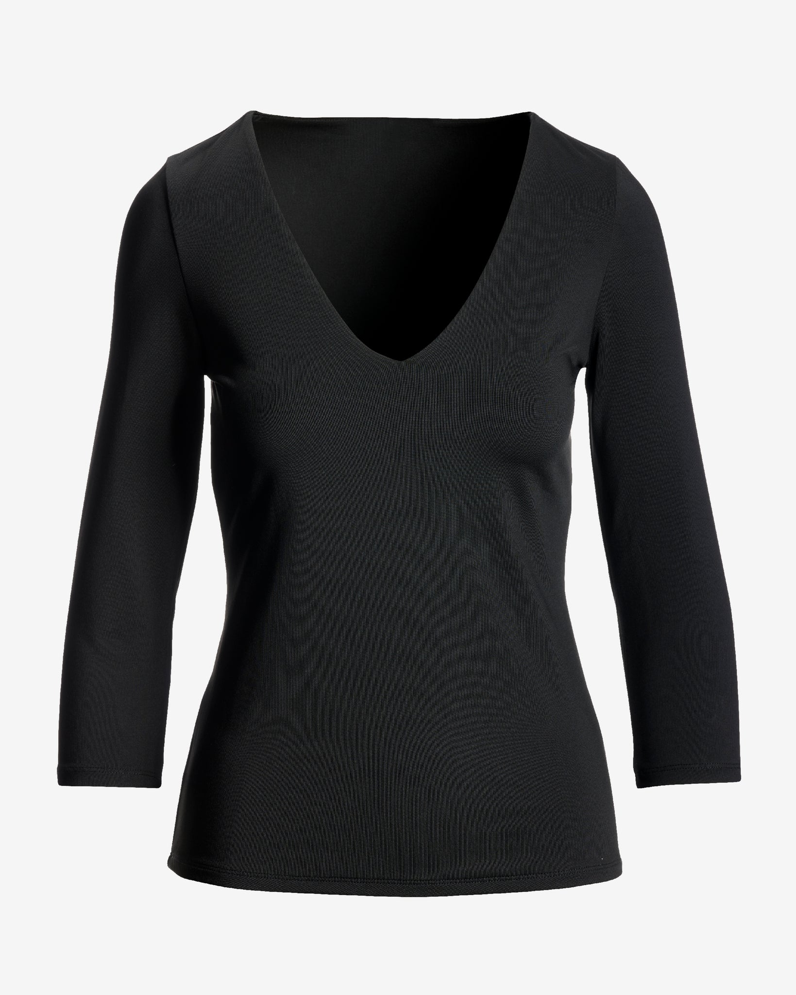 A workweek-to-weekend staple, our three-quarter sleeve top features an ultra-soft stretch fabric cut in a sleek silhouette with a v-neckline. With its smoothing fit and clean lines, this modern knit provides all day comfort and polish. Wear as a base layer or on its own with your choice of bottoms.