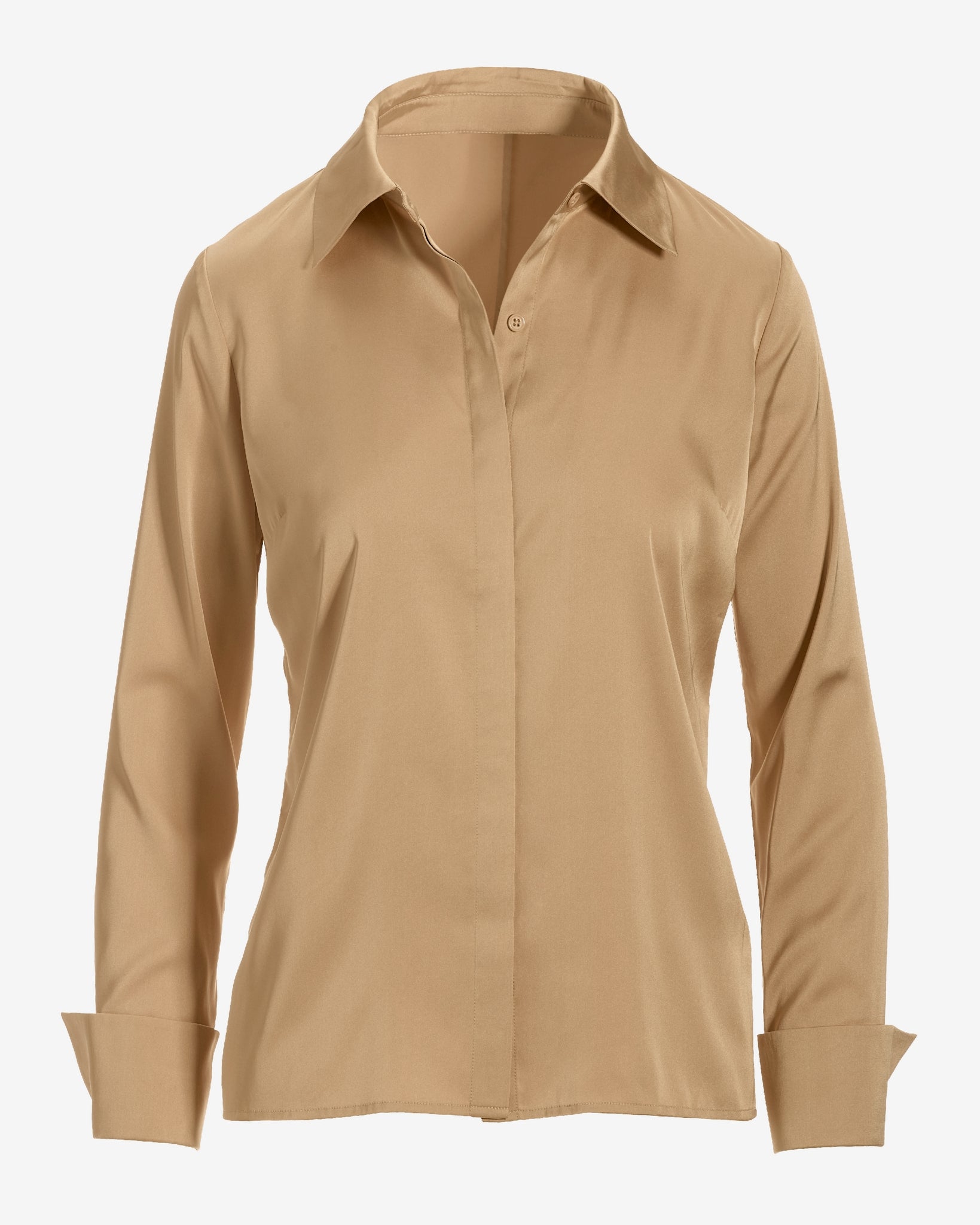 Our silky charmeuse blouse enhances the look of any outfit with its soft sheen and elegant tailoring. This versatile button-up shirt pairs flawlessly with everything from topping denim jeans to a layering essential under blazers, while offering luxurious comfort and ease.