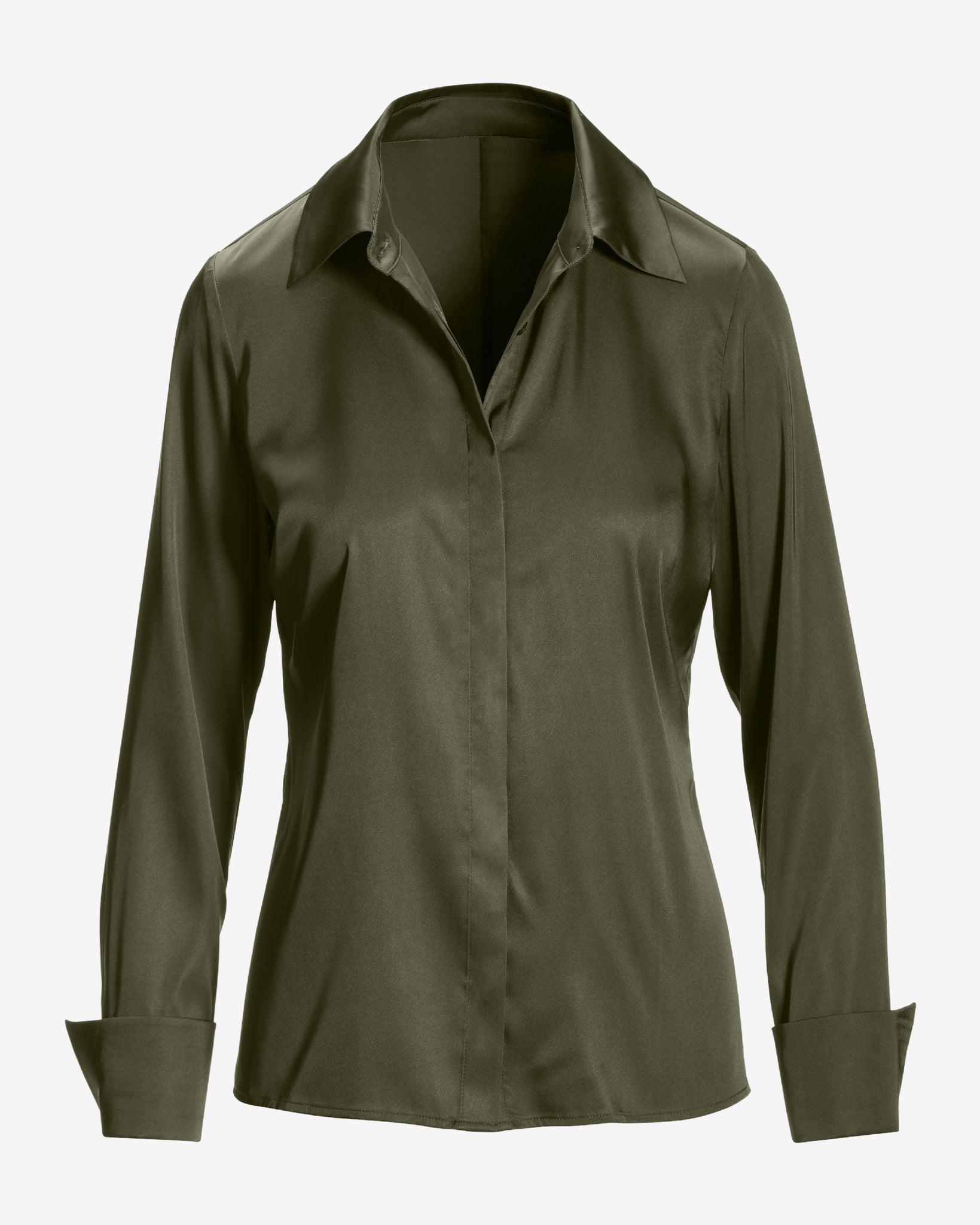 Our silky charmeuse blouse enhances the look of any outfit with its soft sheen and elegant tailoring. This versatile button-up shirt pairs flawlessly with everything from topping denim jeans to a layering essential under blazers, while offering luxurious comfort and ease.