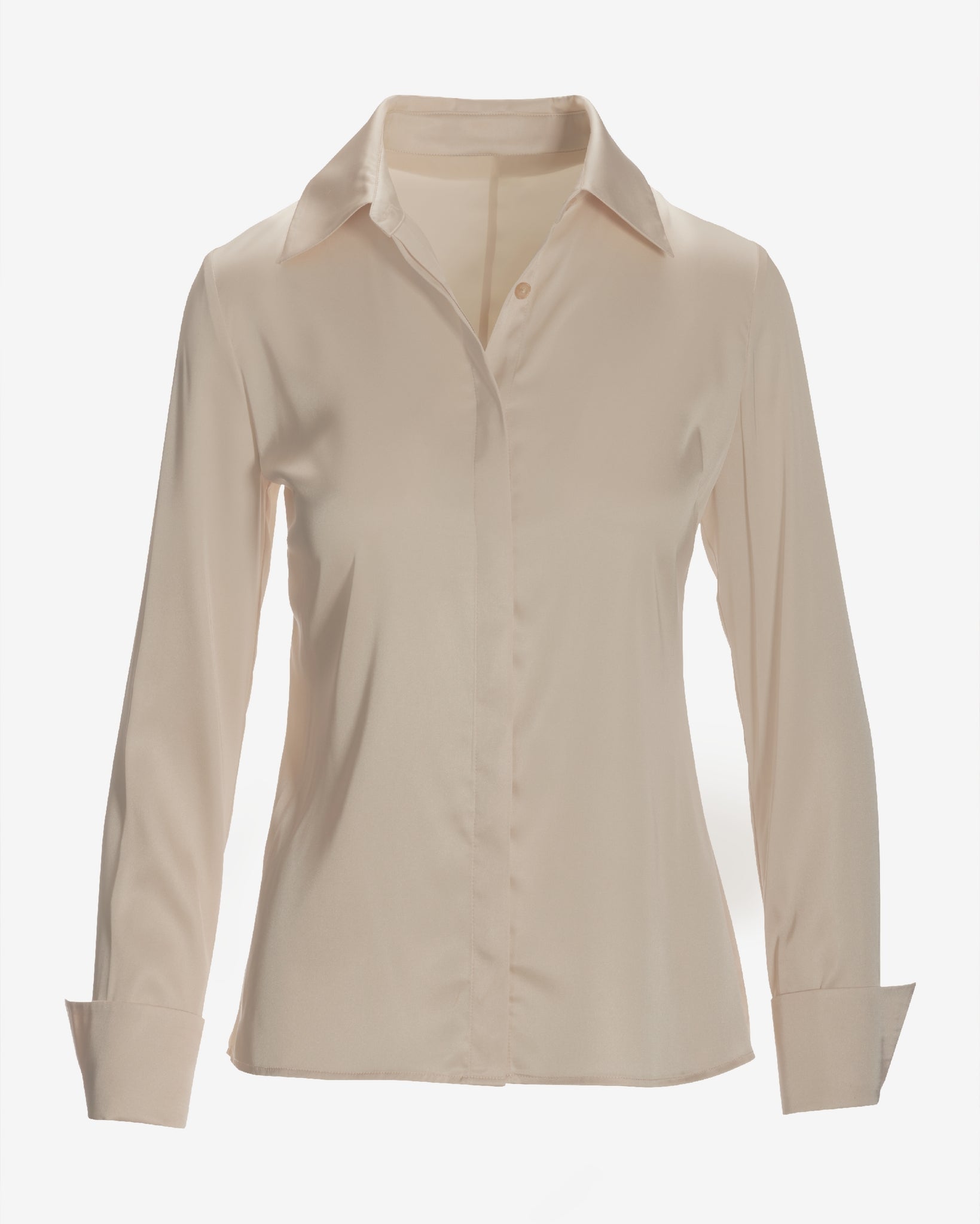 Our silky charmeuse blouse enhances the look of any outfit with its soft sheen and elegant tailoring. This versatile button-up shirt pairs flawlessly with everything from topping denim jeans to a layering essential under blazers, while offering luxurious comfort and ease.