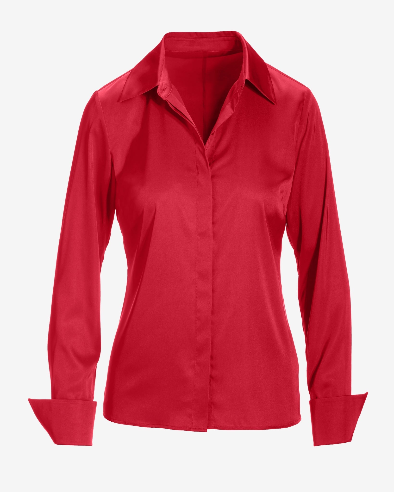 Our silky charmeuse blouse enhances the look of any outfit with its soft sheen and elegant tailoring. This versatile button-up shirt pairs flawlessly with everything from topping denim jeans to a layering essential under blazers, while offering luxurious comfort and ease.