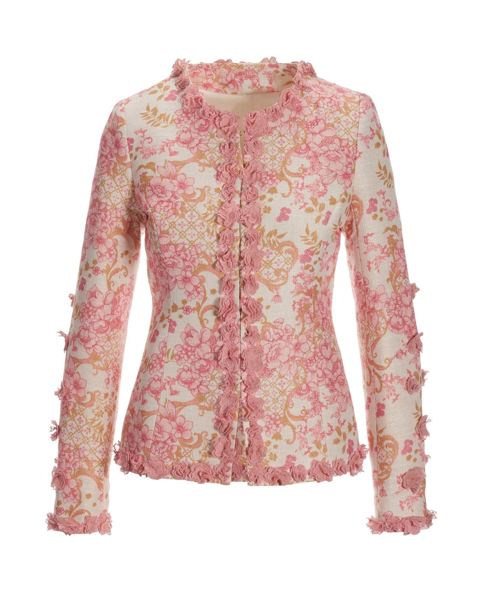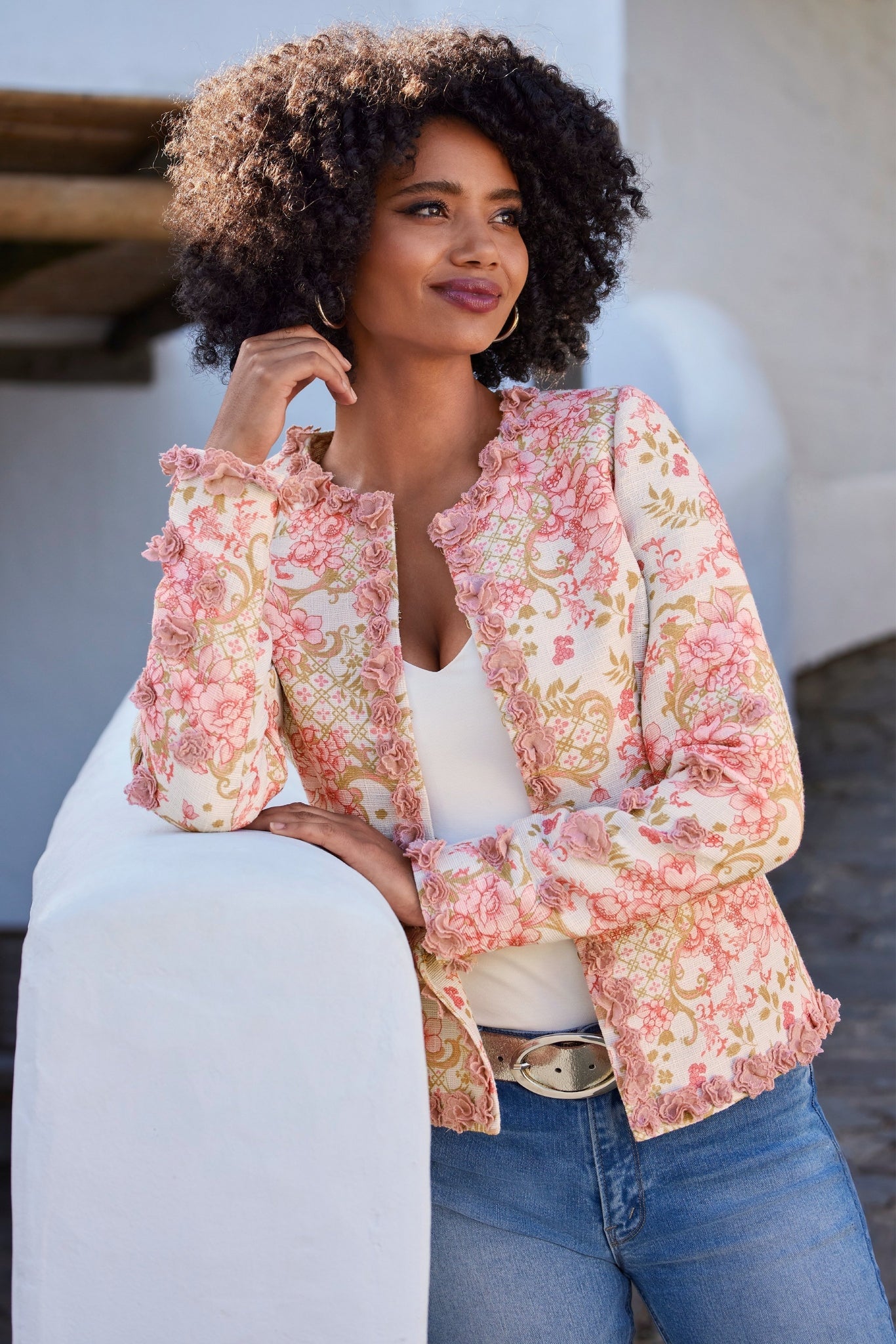 Stylishly tailored to flatter every figure, this ooh-la-la floral print jacket features an easy stretch lining for a comfortable fit and dimensional details that lend beautiful feminine style to every look. A must-have layering piece for the season.