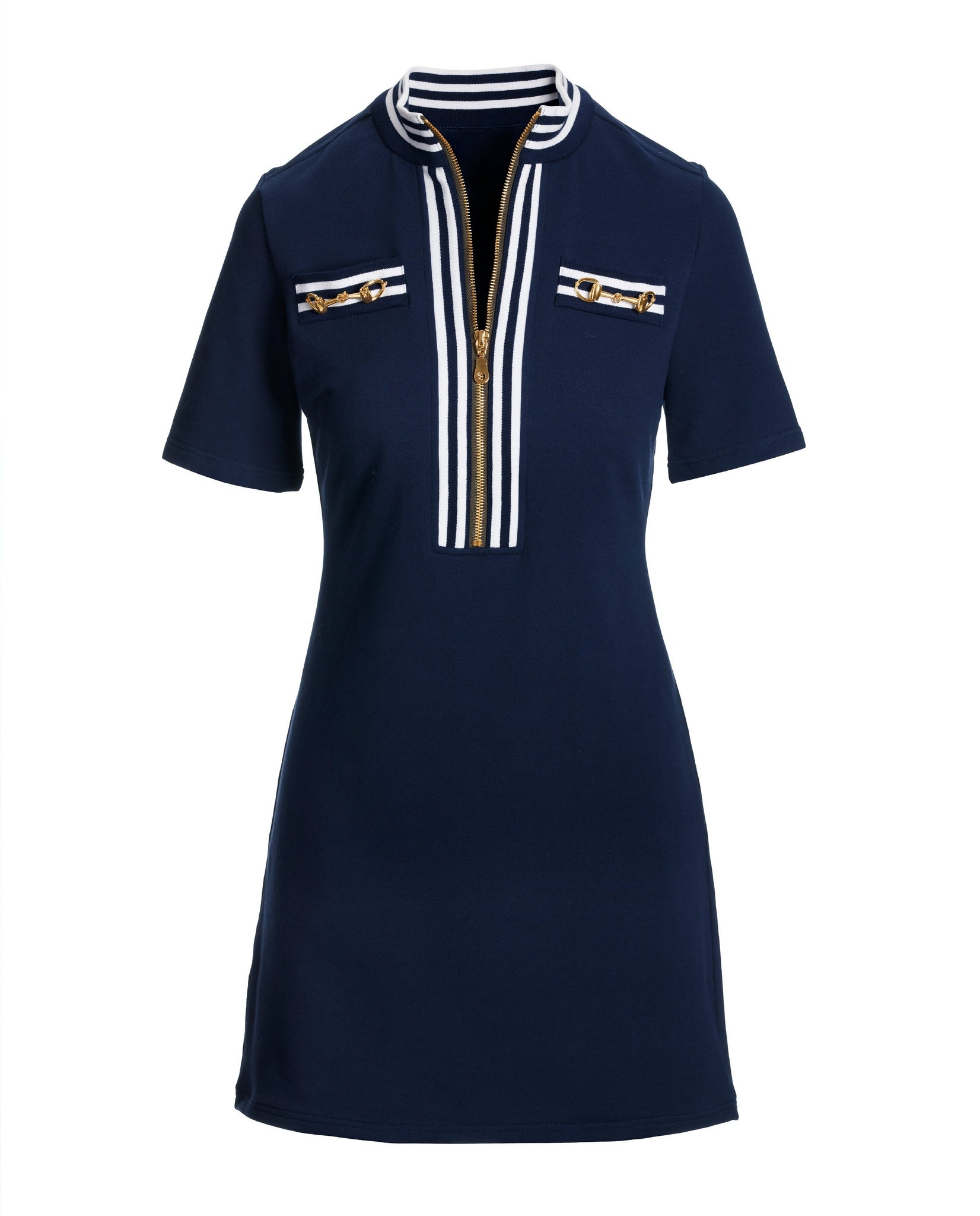 The luxuriously comfortable fabric of this sporty Striped French Terry Hardware Zipper Dress ensures both comfort and style with every step. Contrasting stripes add understated charm to this tailored athleisure dress that's ready to pair with stylish sandals or trendy sneakers.