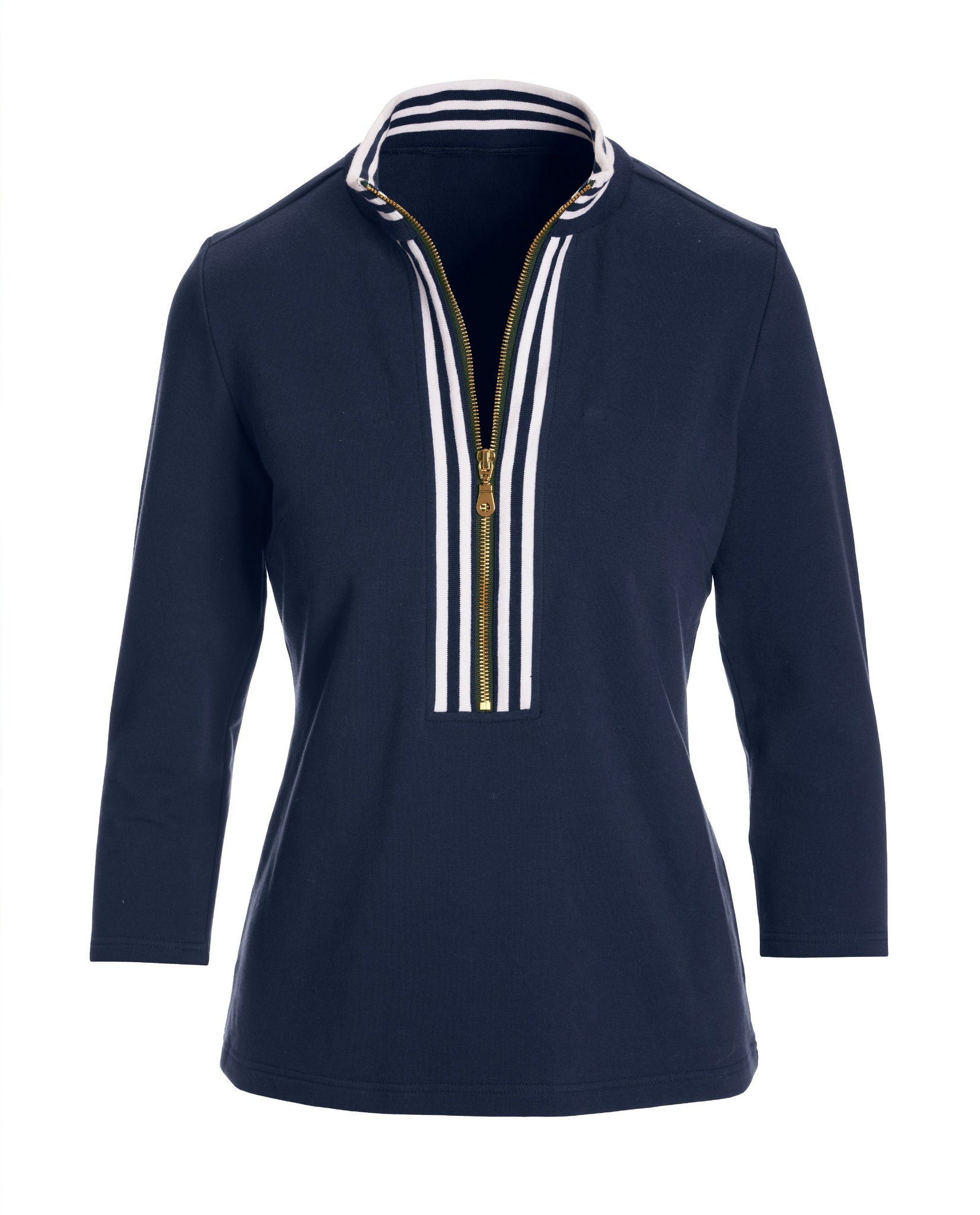 The luxuriously comfortable fabric of this sporty Striped French Terry Hardware Zipper Top ensures both comfort and style. Contrasting stripes add understated charm to this tailored athleisure top that's ready to pair with our B-Active High-Waist Flare Sport Pant or your favorite pants or denim.