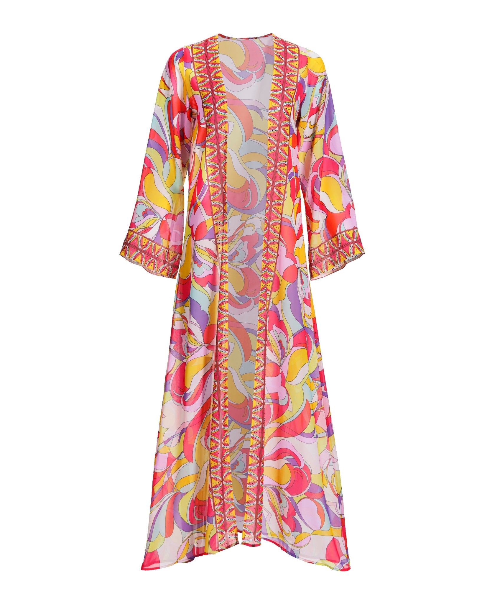 Take this splashy kimono cover-up on your next getaway for colorful poolside posh style, then pair with shorts, jeans, and dresses as a standout layer for day and night.