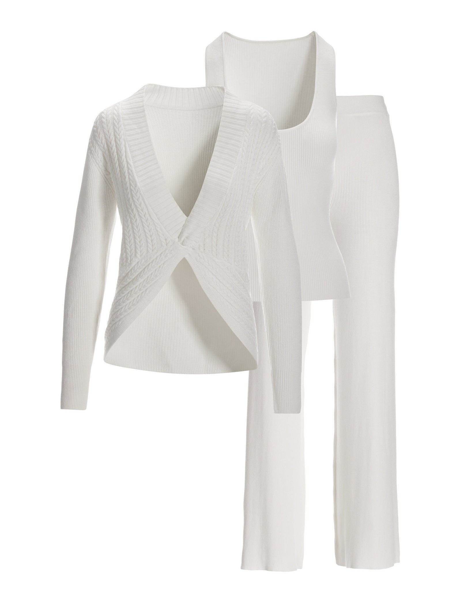 Luxuriate in warmth and comfort as you relax in this sumptuously soft ribbed twist-front sweater, flattering lounge pants and matching scoop-neck top. Embrace the lounging lifestyle.