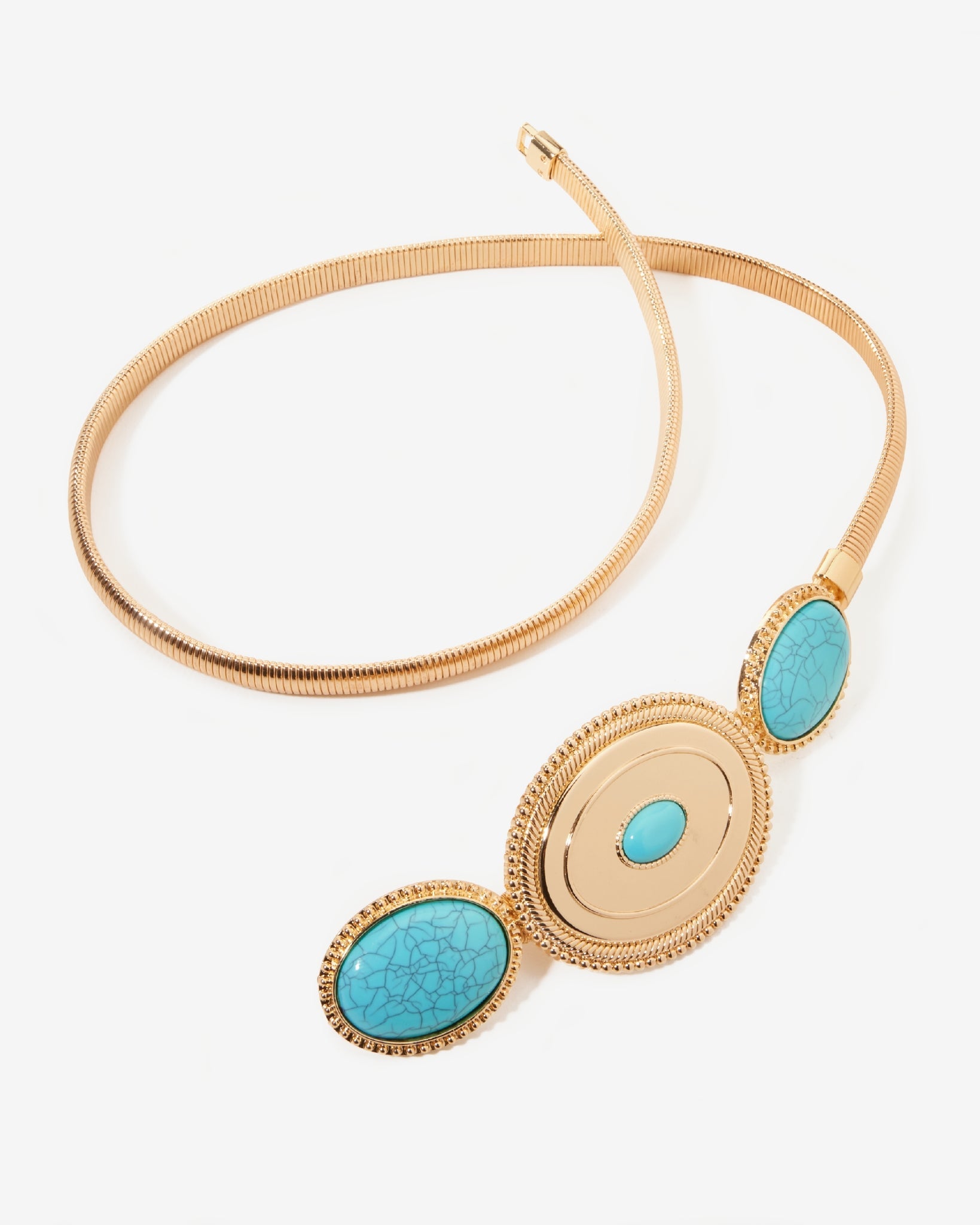 The Triple Stone Slinky Buckle Belt brings bold energy to every look. With its gleaming gold-tone finish and trio of turquoise-hued stones at the center, this belt was made to stand out. The slinky, flexible chain molds comfortably to your waist while adding instant shine. Whether you're styling a maxi dress or a tailored jumpsuit, this statement piece ties it all together.