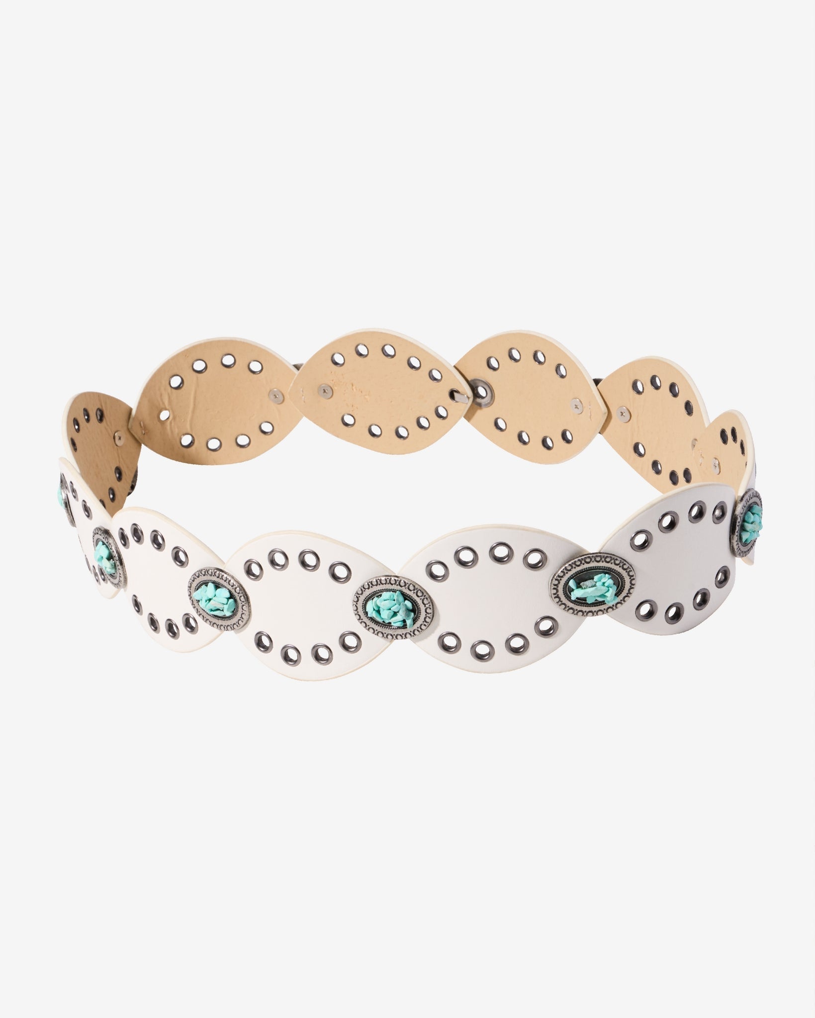 Add a touch of boho-chic flair to your look with our turquoise grommet leather waist belt. Featuring leaf-shaped panels with grommet accents and turquoise stone embellishments, this waist-defining accessory is ideal for elevating dresses or cinching relaxed layers.