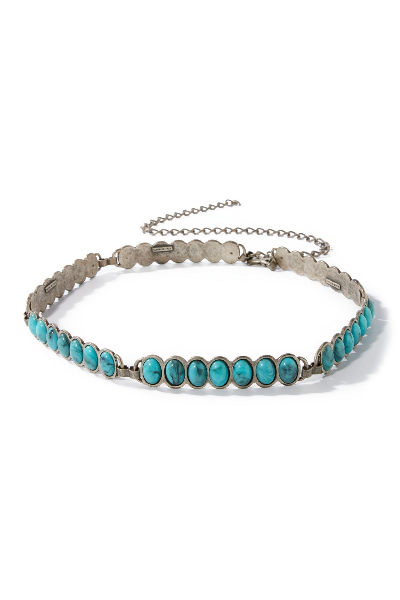 Creating fashionable boho looks is a cinch with this skinny hip belt featuring inlaid turquoise baubles and adjustable closure for a comfortable fit