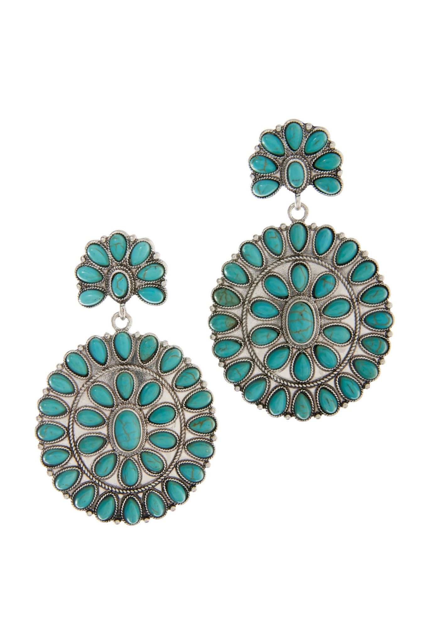 Adorned with inlaid turquoise baubles, these statement accessory earrings impart effortless boho style to any wardrobe looks.