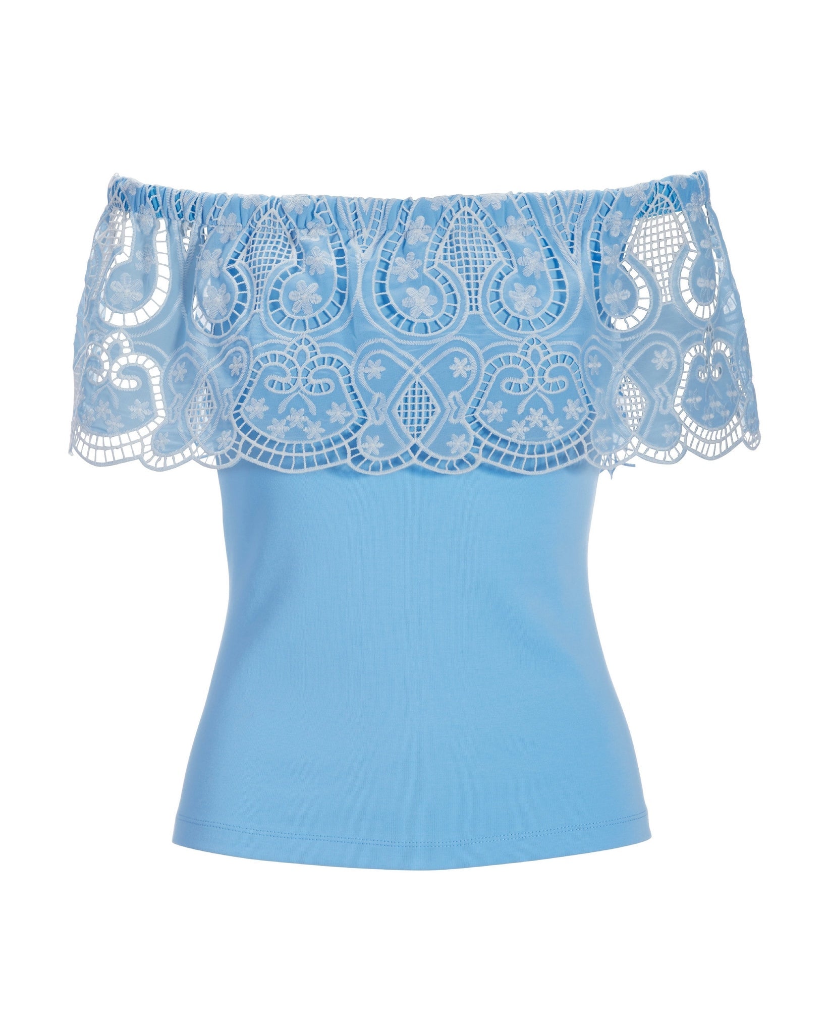 An easy knit cami is topped with a two-tone lace off-the-shoulder overlay finished with scalloped details.