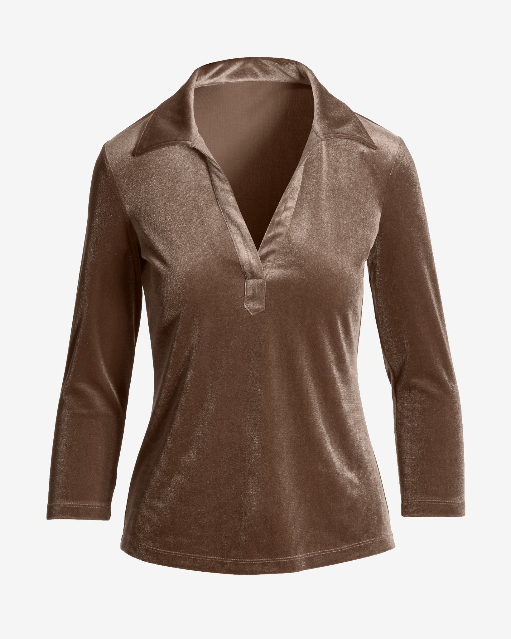 Designed with your comfort in mind, our collared top features a soft velvet hand-feel that is luxurious against the skin. It's a versatile three-quarter sleeve knit top to dress up or down for any occasion.